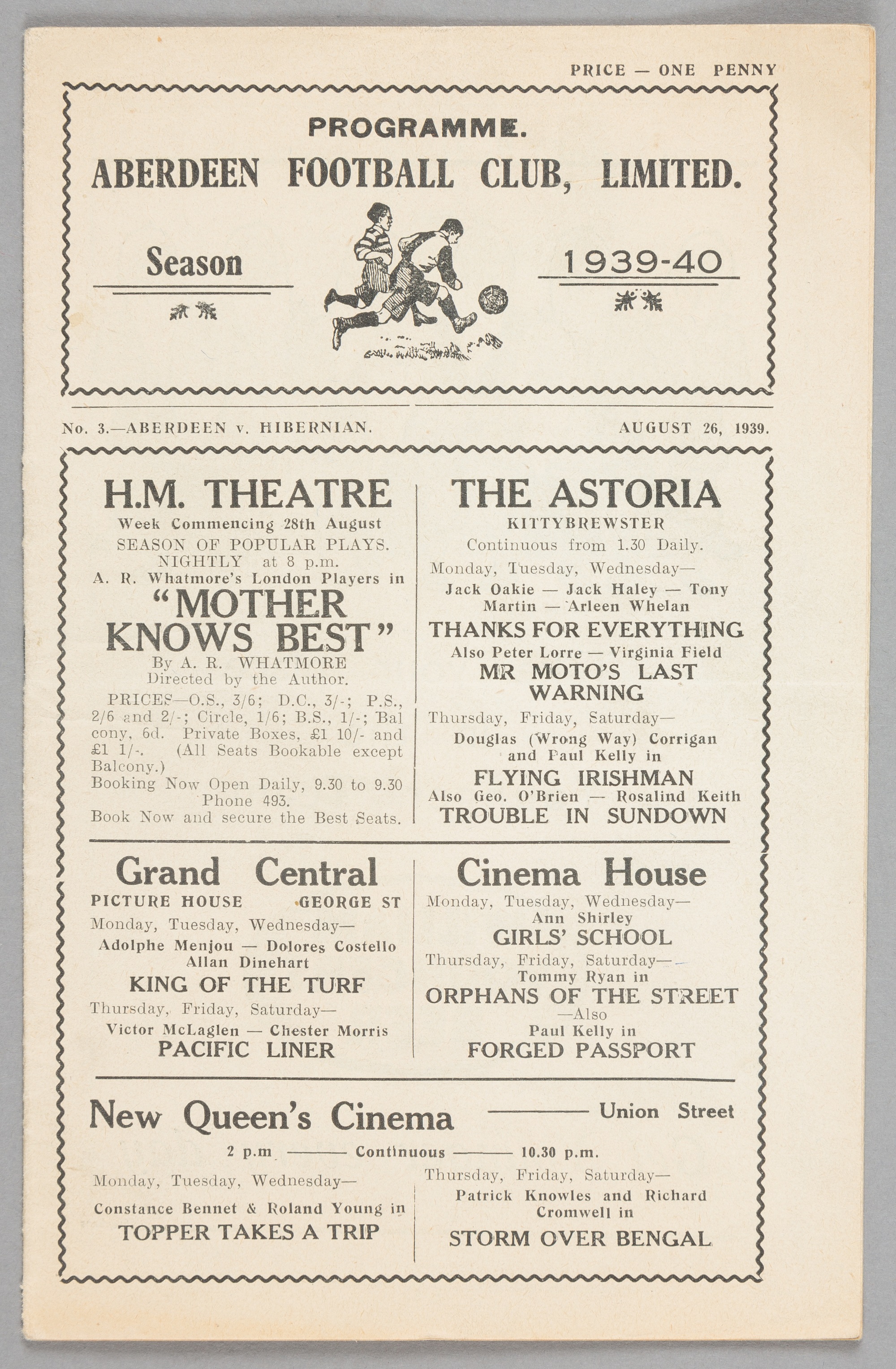 Aberdeen v Hibernian proramme 26th August 1939, Scottish F.L. Division One fixture This was Aberdeen's final home match before the Scottish Football League was suspended after the outbreak of WWII.