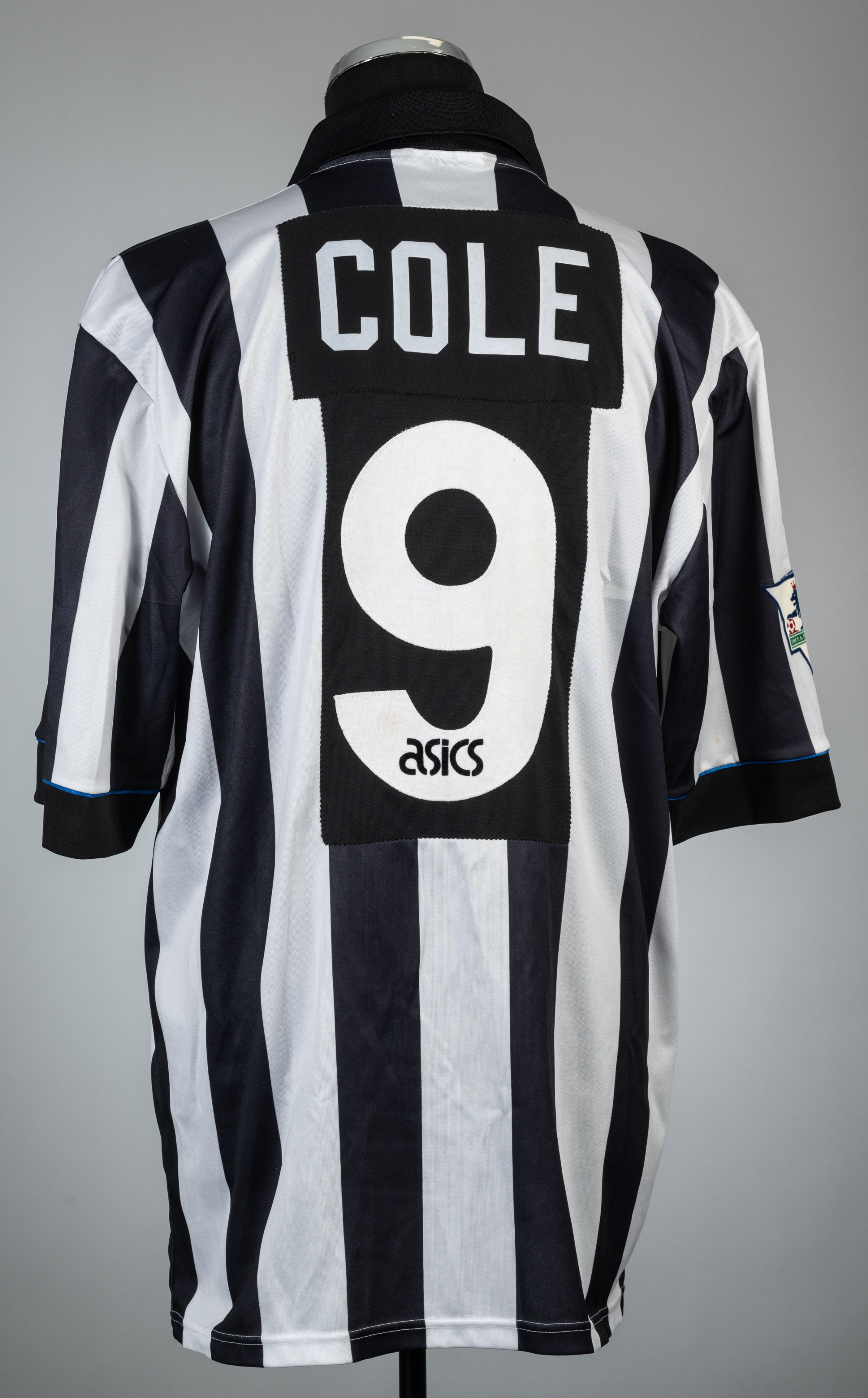 Andy Cole black and white striped Newcastle United no.9 home jersey, season 1993-94, Asics, shorts-sleeved with THE FA PREMIER LEAGUE sleeve badges, club crest and sponsor logo, reverse lettered COLE, size XL