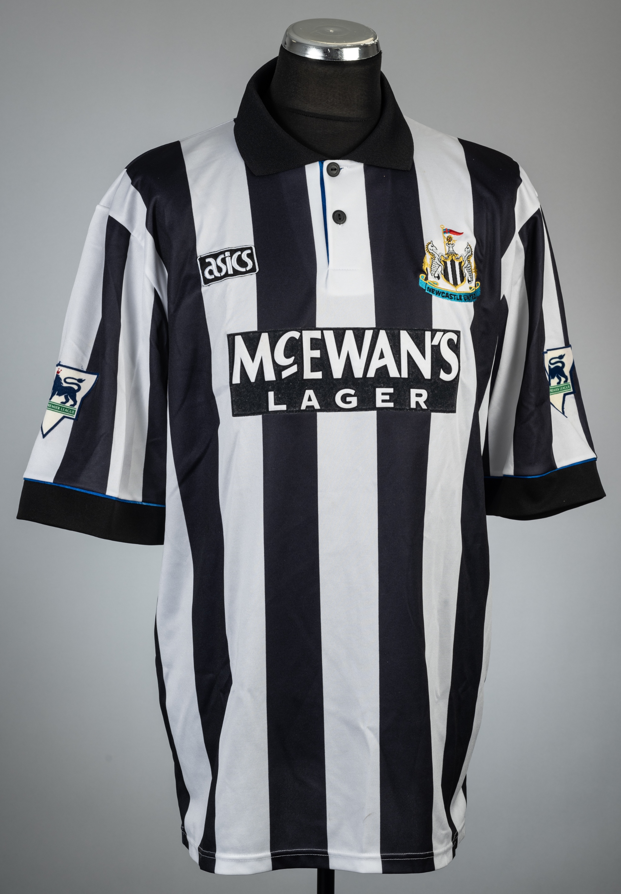Andy Cole black and white striped Newcastle United no.9 home jersey, season 1993-94, Asics, shorts-sleeved with THE FA PREMIER LEAGUE sleeve badges,