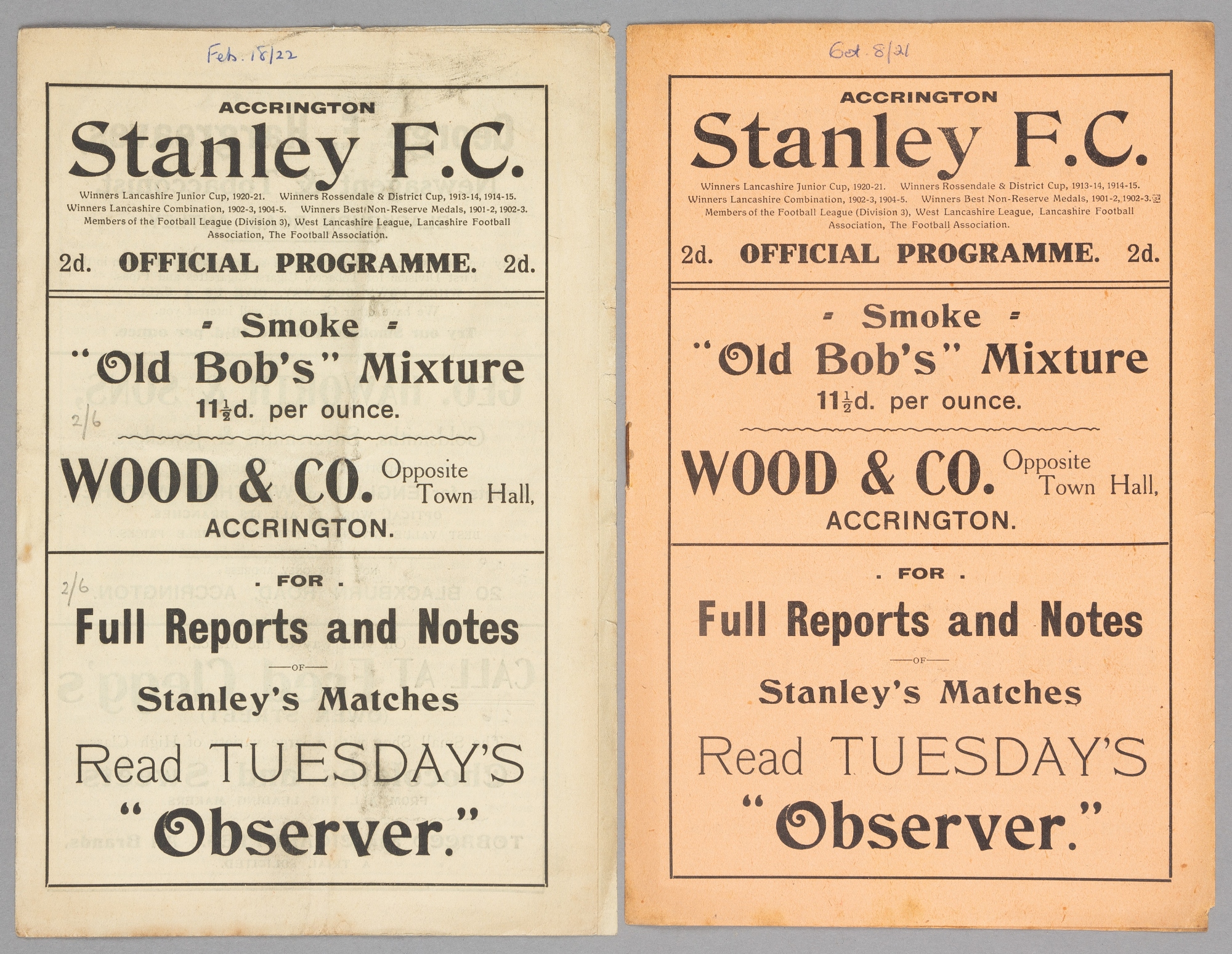Two Accrington Stanley home programmes from their first season in the Football League (Division Three North) 1921-22, v Nelson and Wigan Borough