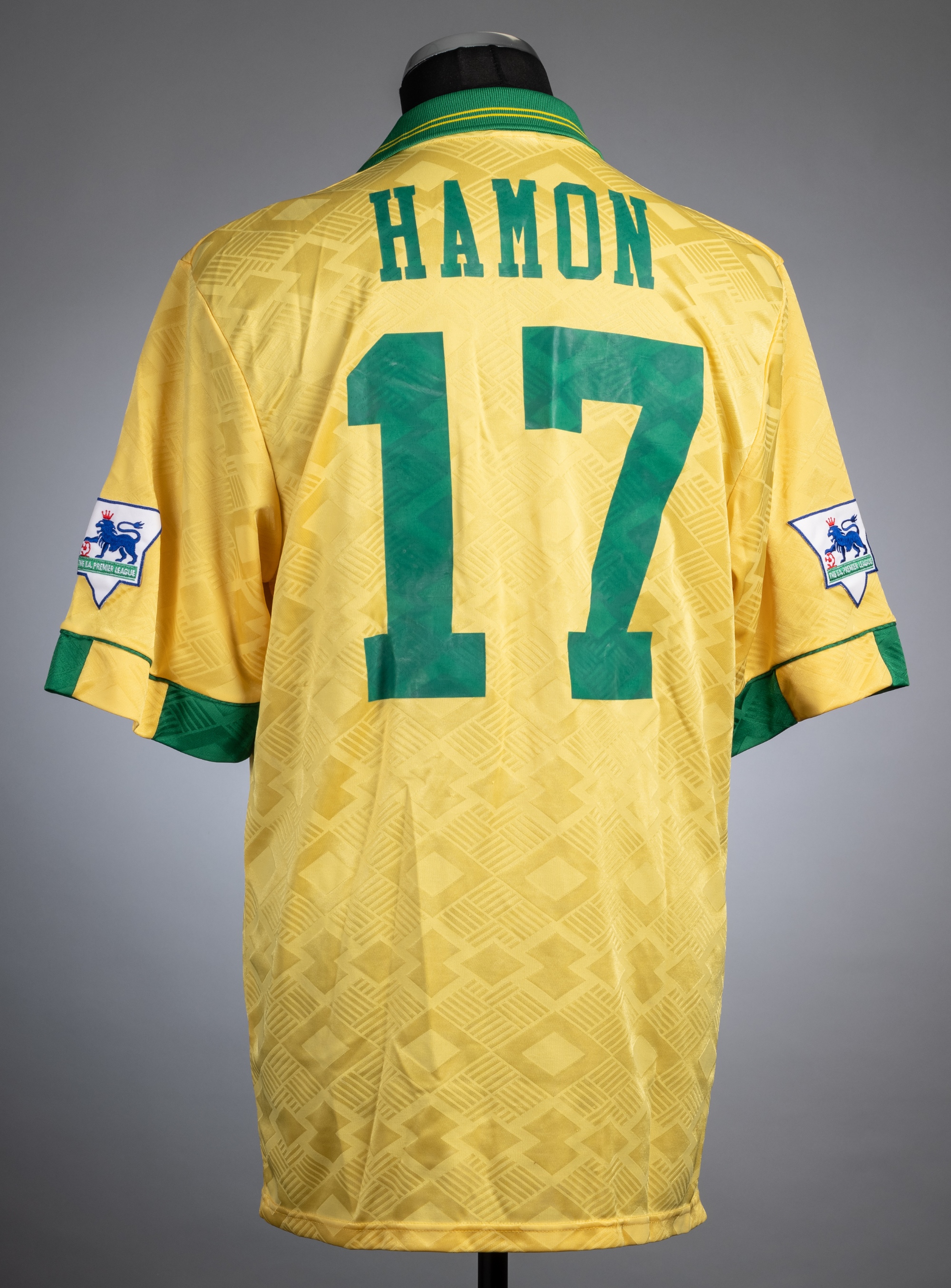 Two Swindon Town home and away football jerseys, season 1993-94, comprising Chris Hamon yellow and green Swindon Town no.17 away jersey, season 1993-