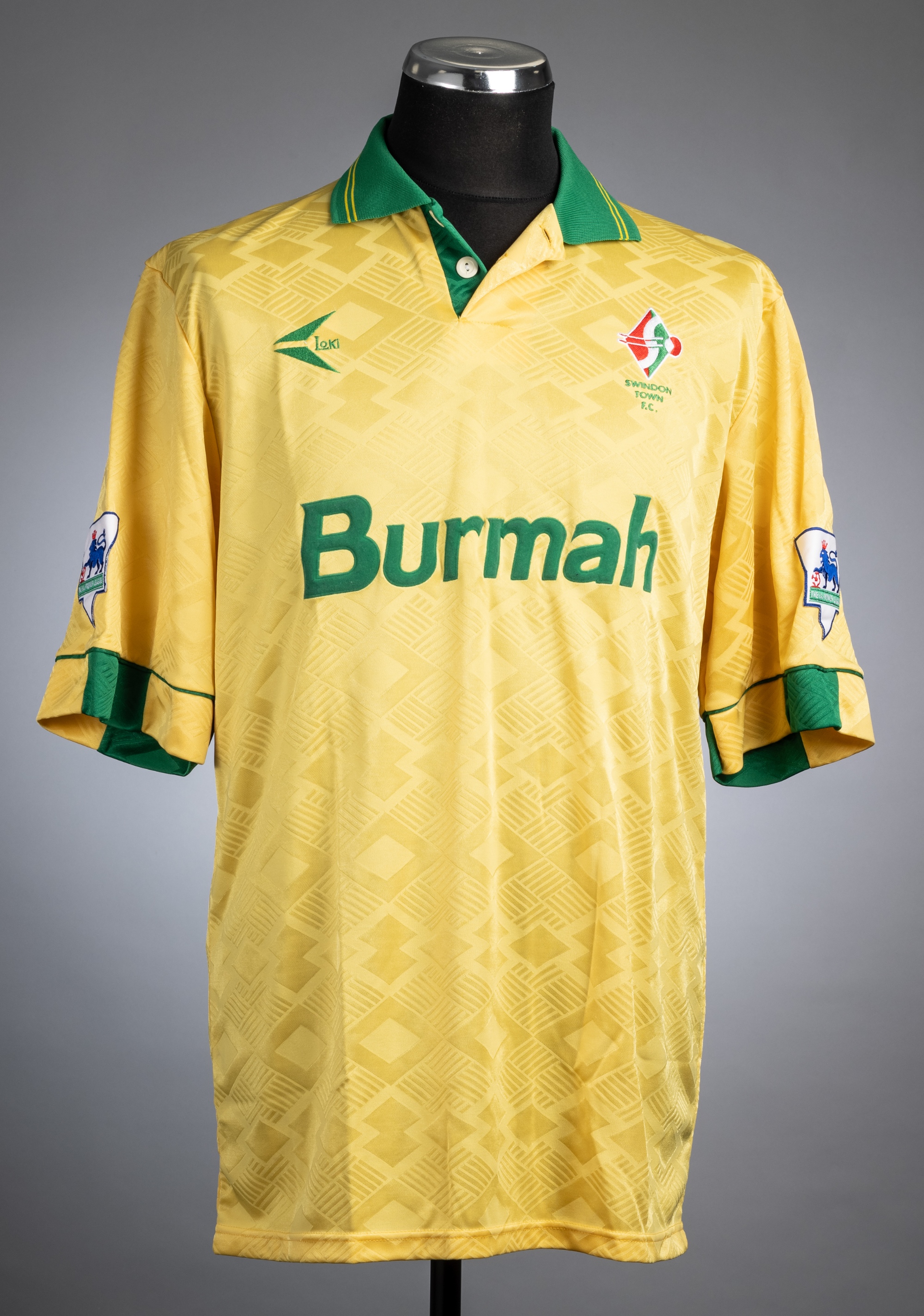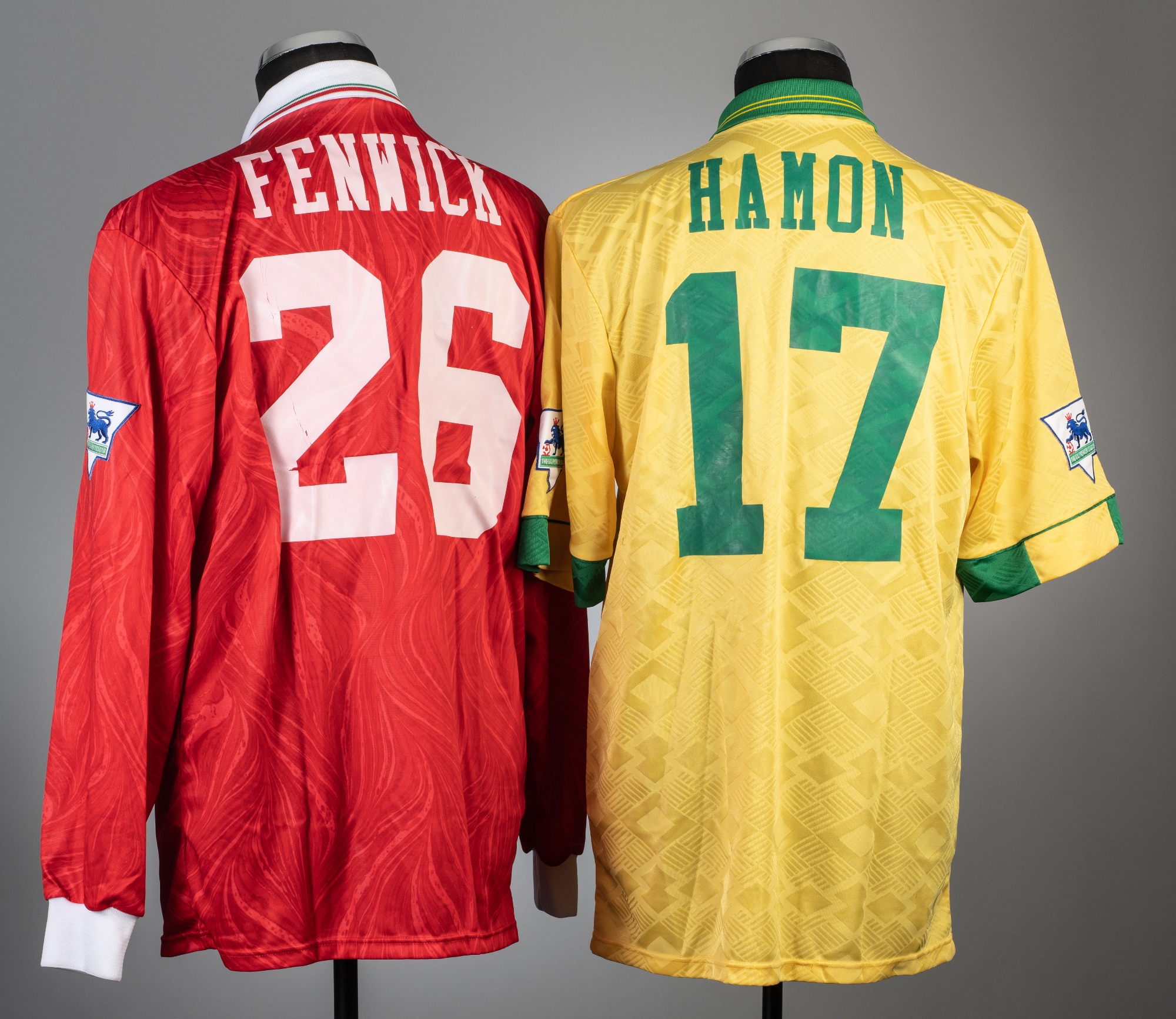 Two Swindon Town home and away football jerseys, season 1993-94, comprising Chris Hamon yellow and green Swindon Town no.17 away jersey, season 1993-94, short-sleeved with THE FA PREMIER LEAGUE sleeve badges, club crest and sponsor logo, reverse lettered HAMON and Terry Fenwick red Swindon Town no.26 home jersey, season 1993-94, long-sleeved with THE FA PREMIER LEAGUE sleeve badges, club crest and sponsor logo, reverse lettered FENWICK, size 42-44in., wear to number on reverse, (2)