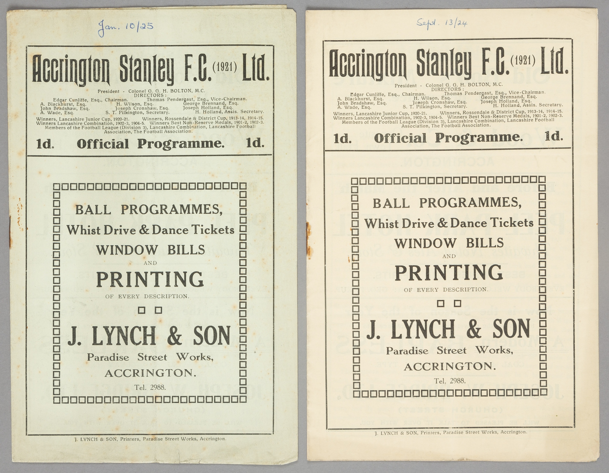 Two Accrington Stanley home programmes season 1924-25, F.L. Division Three North fixture v Nelson and Portsmouth F.A. Cup 1st Round