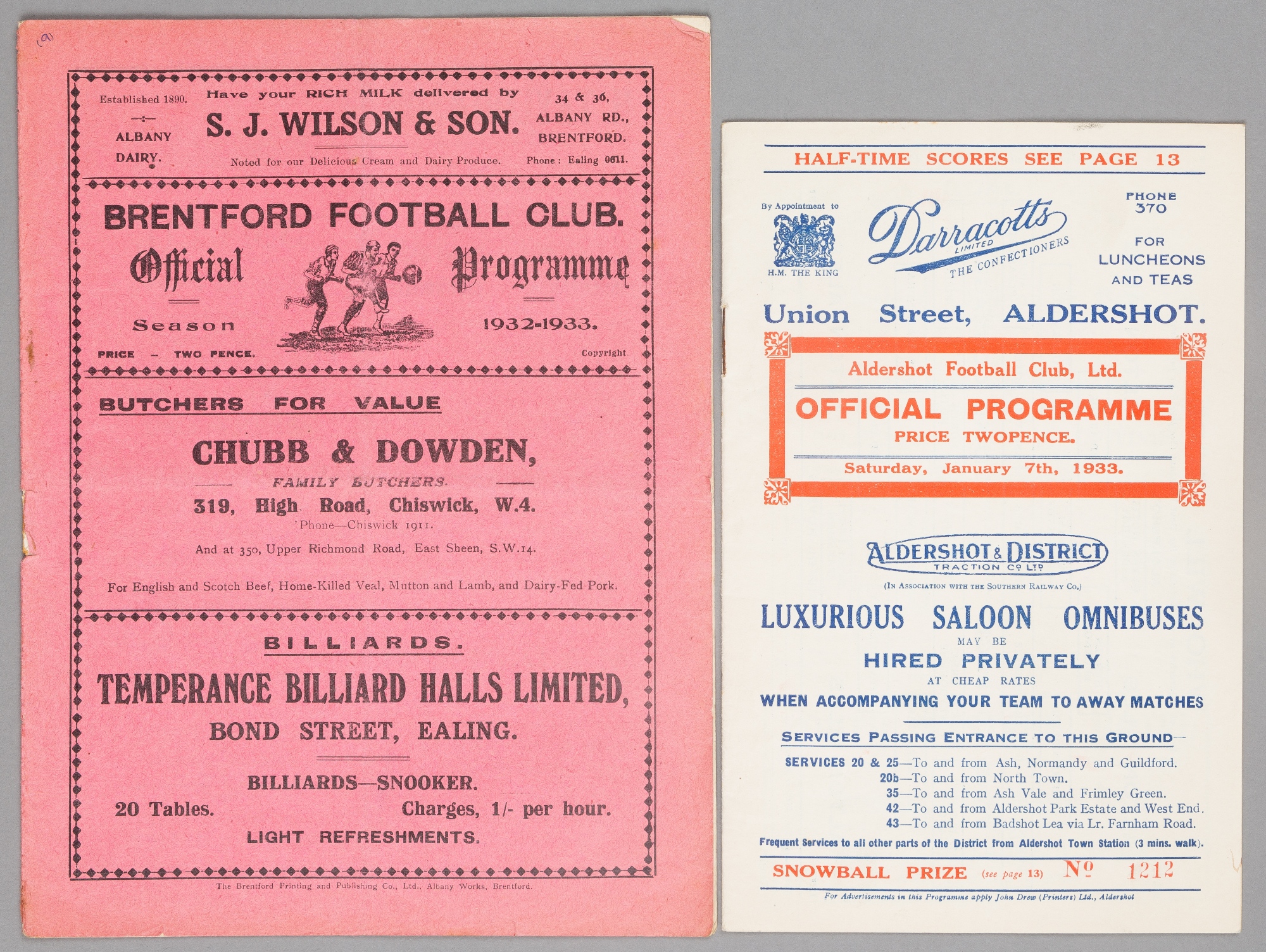 Two Aldershot programmes from their first season in the Football League 1932-33, F.L. Division Three South fixtures, an away at Brentford 26th Decemb