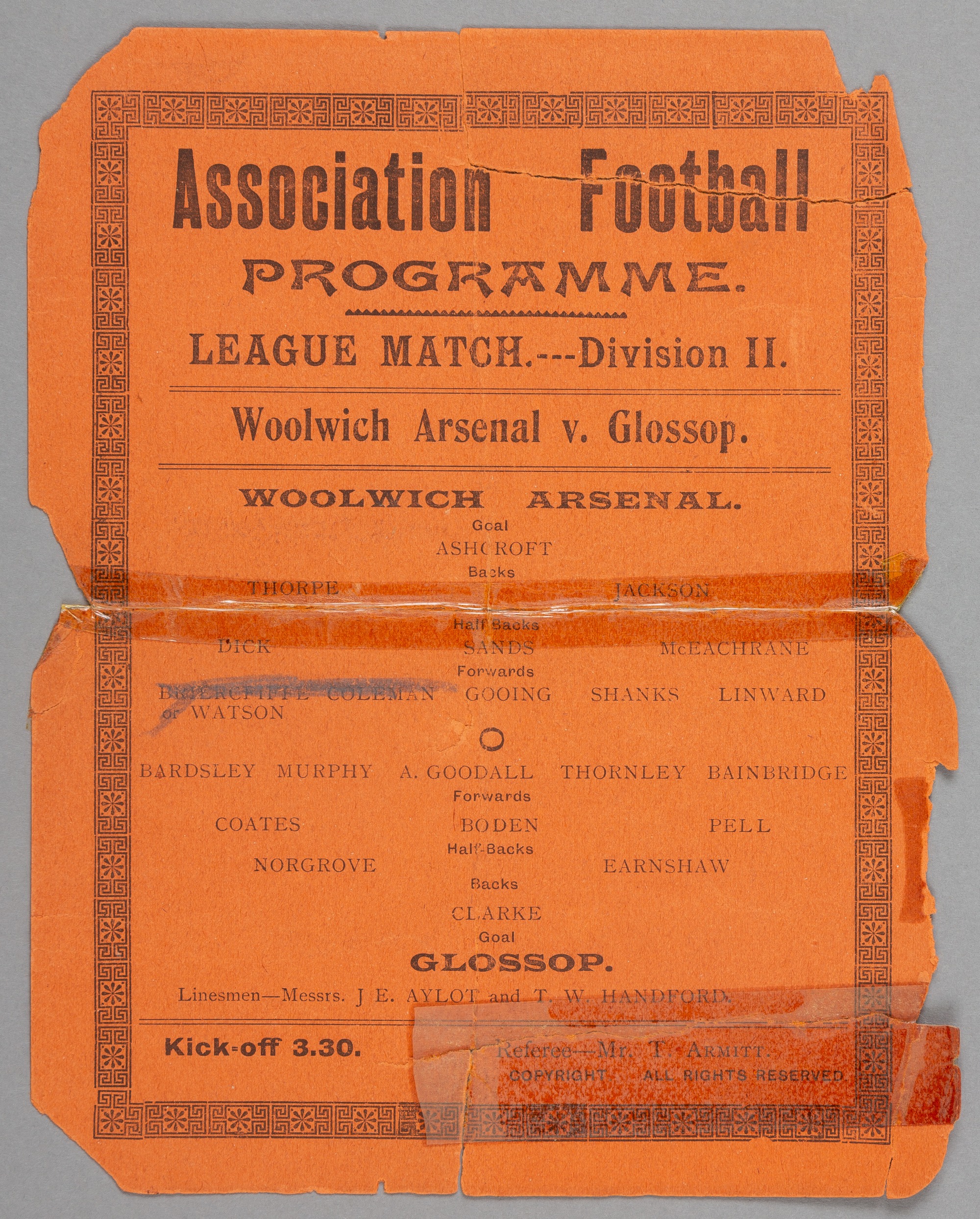 Woolwich Arsenal v Glossop programme 4th April 1904, F.L. Division Two fixture, played at the Manor Ground, Plumstead, with paper loss and cellotape