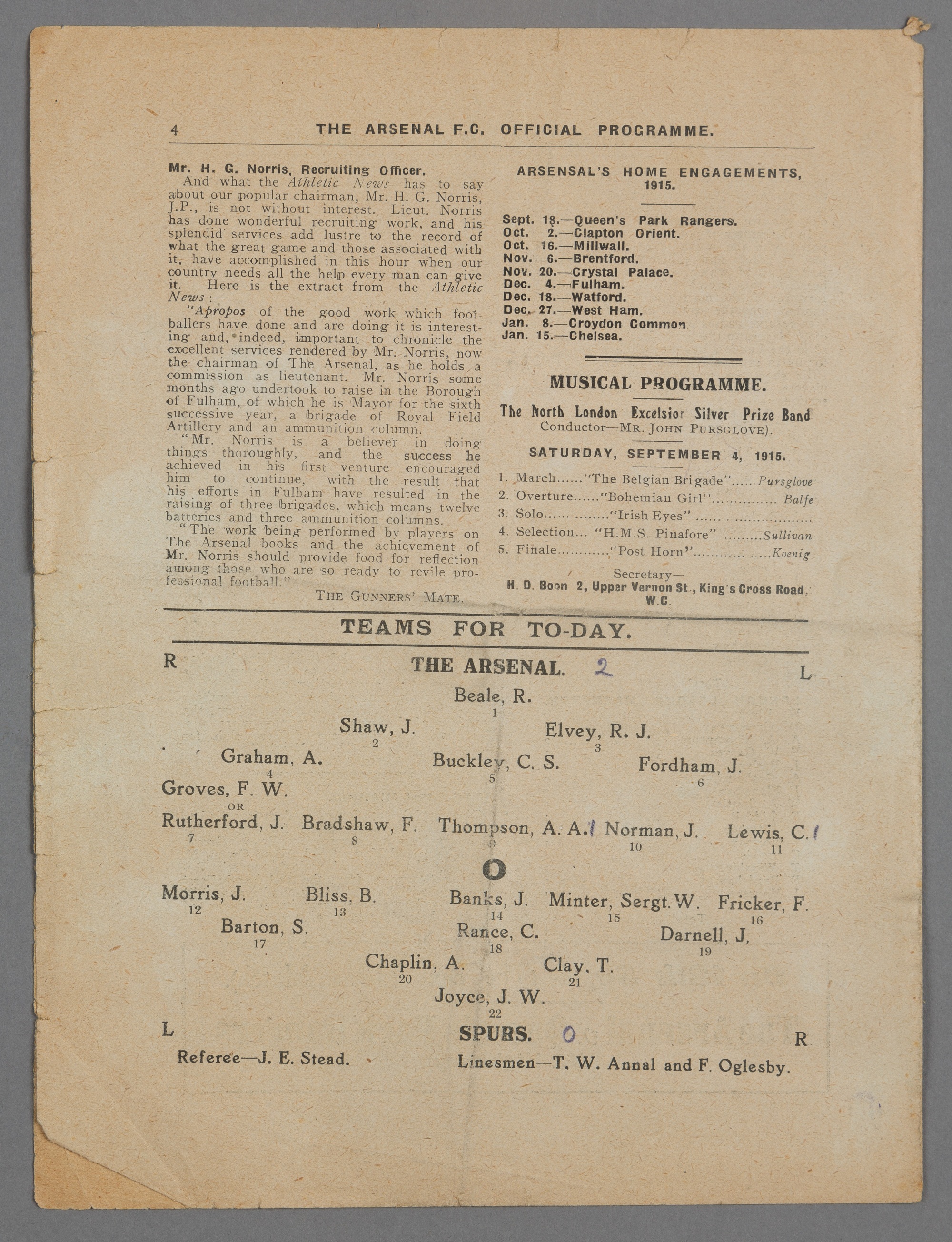 The Arsenal v Tottenham Hotspur World War I programme, played at Highbury, 4th September 1915, four-page programme, with team line-up on reverse page
