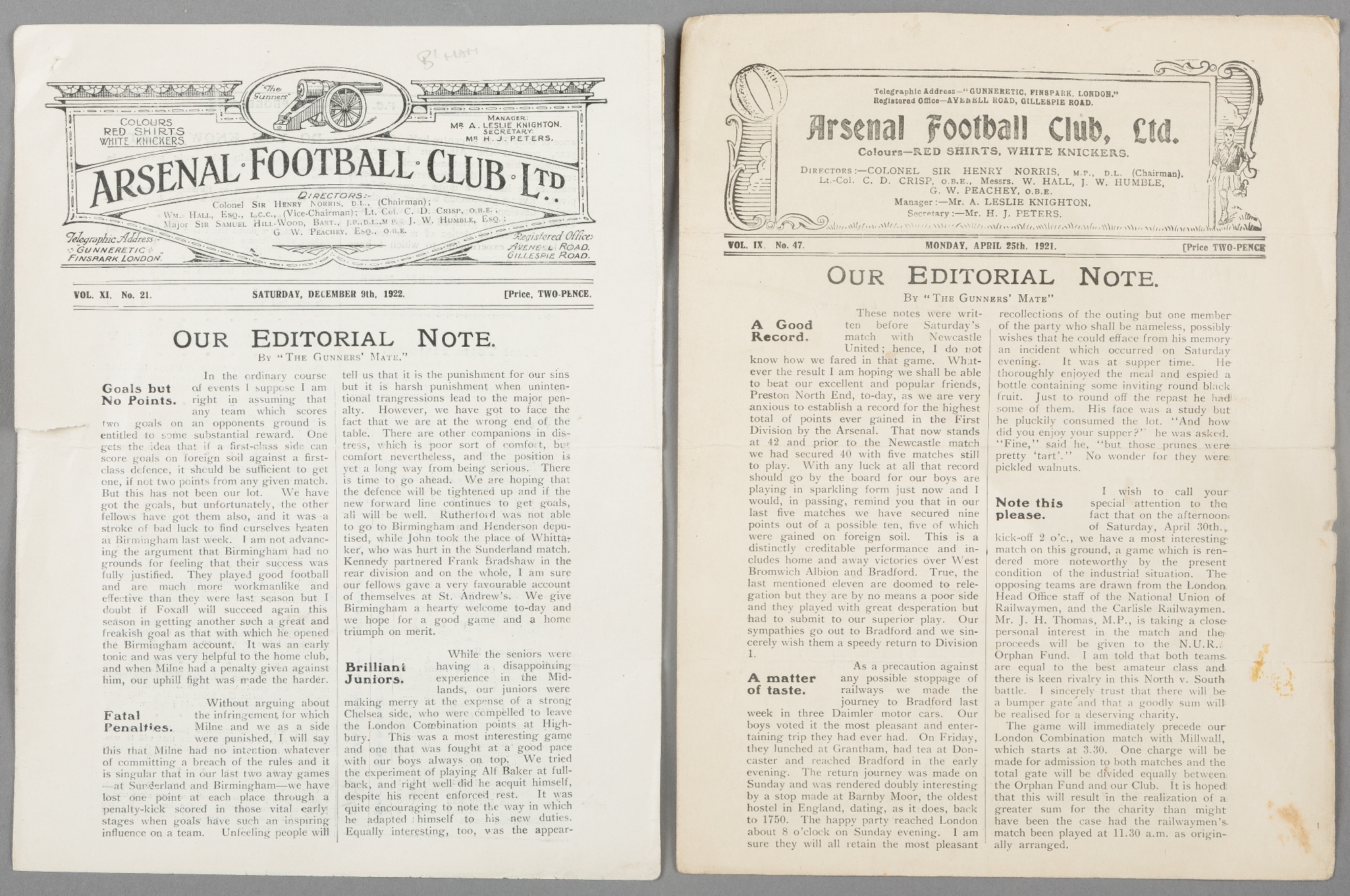 Two Arsenal 1920s home programmes, FL Division One fixtures v Preston North End 25th April 1921 and Birmingham 9th December 1922