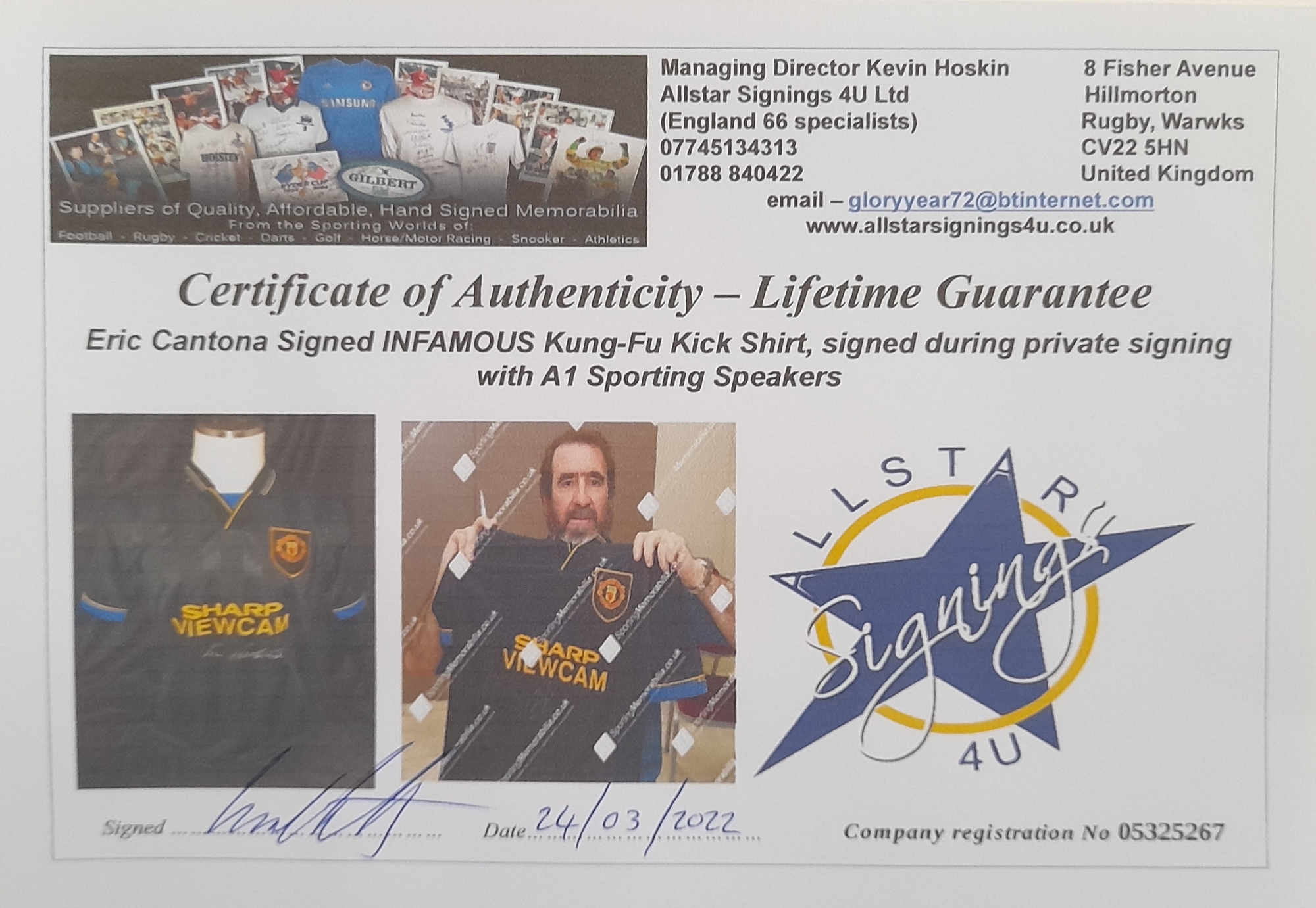 Manchester United Eric Cantona signed black away retro shirt as worn when he administered his Kung-Fu kick upon Matthew Simmons who launched a tirade of abuse at him during a match against Crystal Palace back on 25th January 1995, comes with COA and photo proof from private with Cantona
