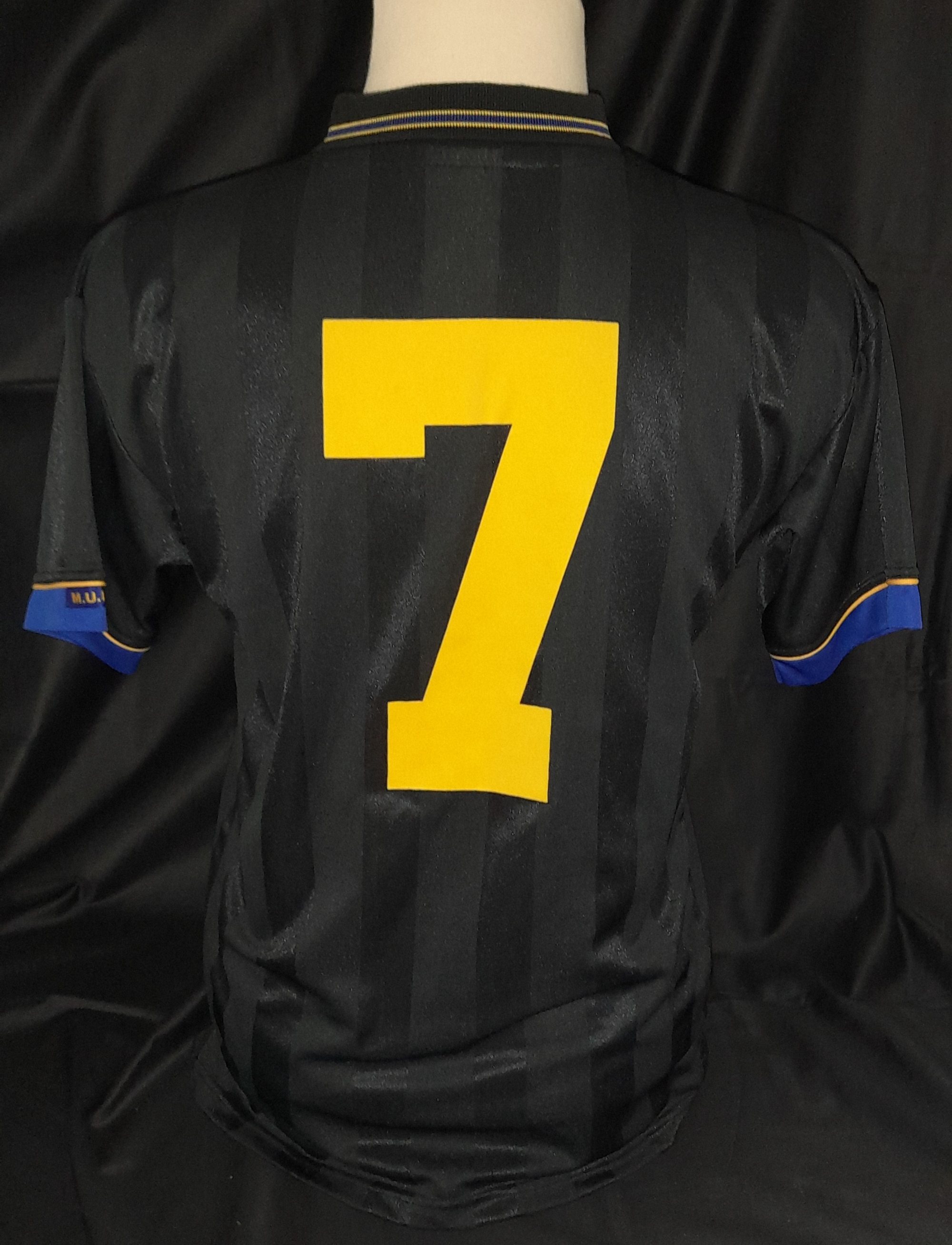 Manchester United Eric Cantona signed black away retro shirt as worn when he administered his Kung-Fu kick upon Matthew Simmons who launched a tirade