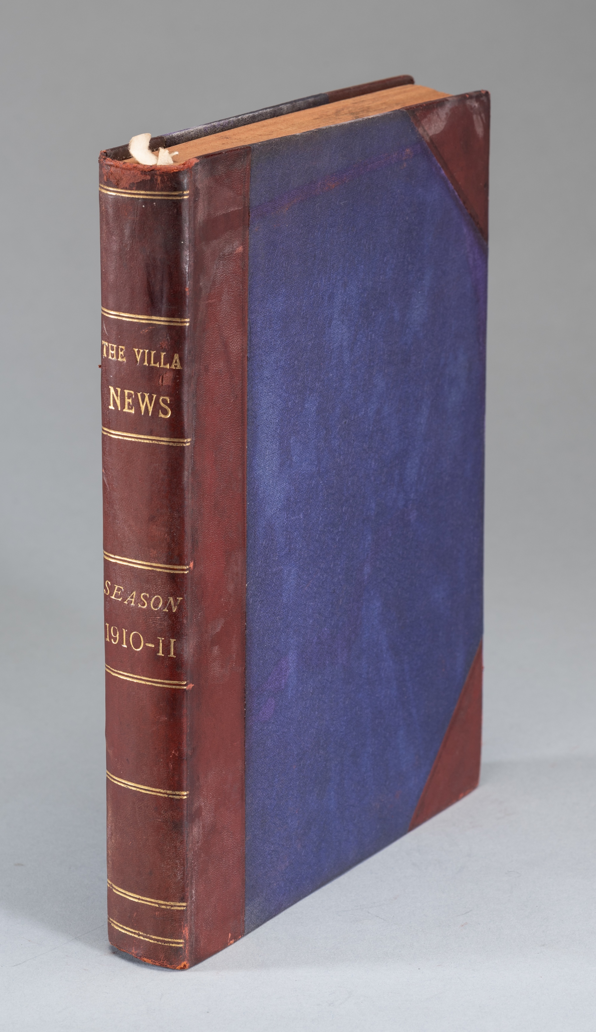 Bound volume of Aston Villa home programmes season 1910-11, the volume containing first team, reserves and other matches played at Villa Park, together with index and statistical pages to back of volume, covers removed from all programmes, leather and cloth boards, gilt titling to spine, some marks and discoloration to bindings but overall good.