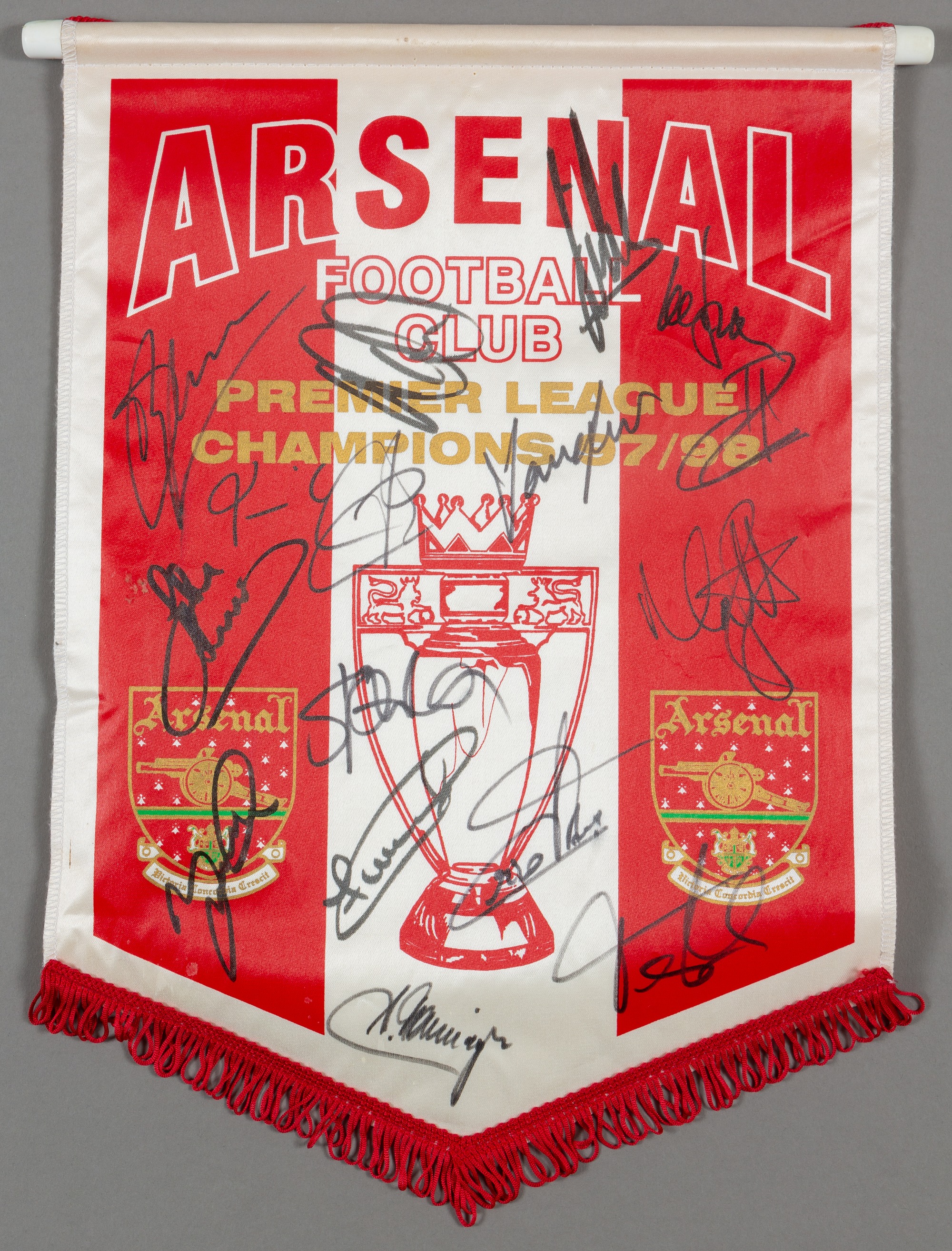ARSENAL FULLY AUTOGRAPHED 1998 PREMIER LEAGUE CHAMPIONS PENNANT. COMMEMORATIVE PENNANT SIZE 16”x12” BEARING FIFTEEN ORIGINAL BLACK PEN SIGNATURES TO INCLUDE: TONY ADAMS, DENNIS BERGKAMP, MARK OVERMARS, EMMANUEL PETIT, PATRICK VIEIRA, IAN WRIGHT, STEVE BOULD, LEE DIXON, DAVID SEAMAN, NIGEL WINTERBURN, RAY PARLOUR, ALEX MANNINGER ETC. GOOD CONDITION.