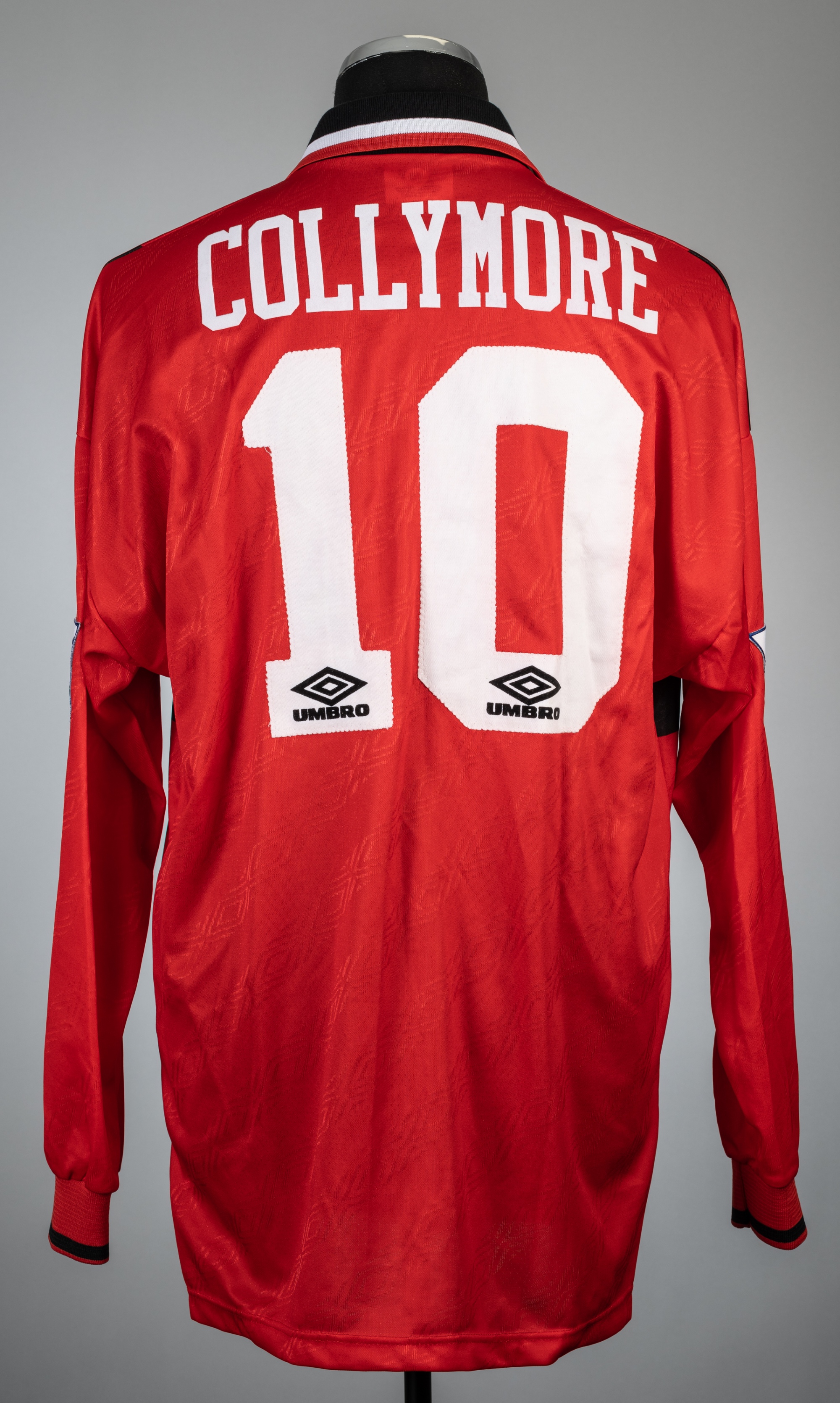 Stan Collymore red and black Nottingham Forest no.10 home jersey, season 1994-95, Umbro, long-sleeved with THE FA PREMIER LEAGUE sleeve badges, club crest and sponsor logo, reverse lettered COLLYMORE, size XL