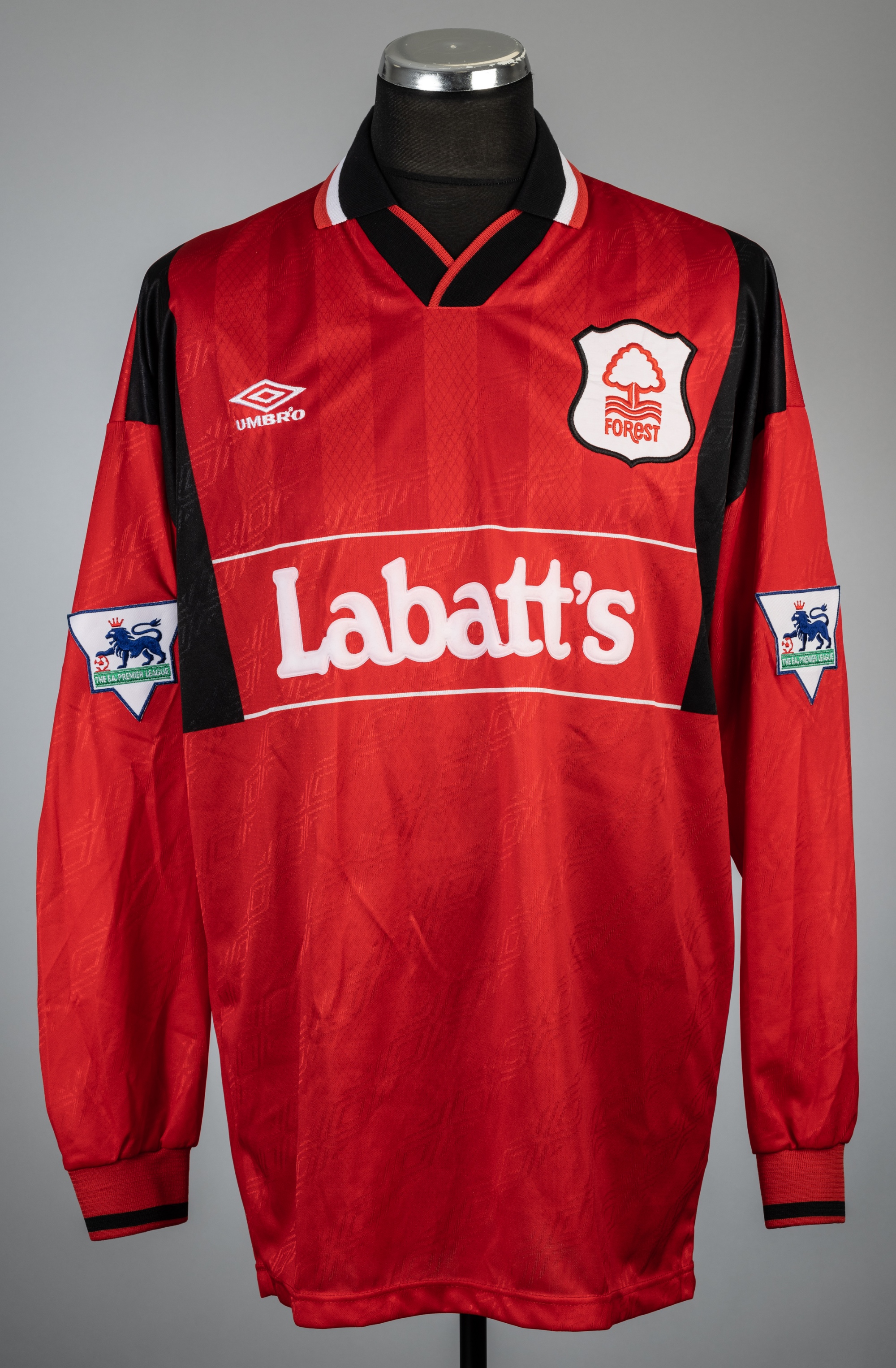 Stan Collymore red and black Nottingham Forest no.10 home jersey, season 1994-95, Umbro, long-sleeved with THE FA PREMIER LEAGUE sleeve badges, club