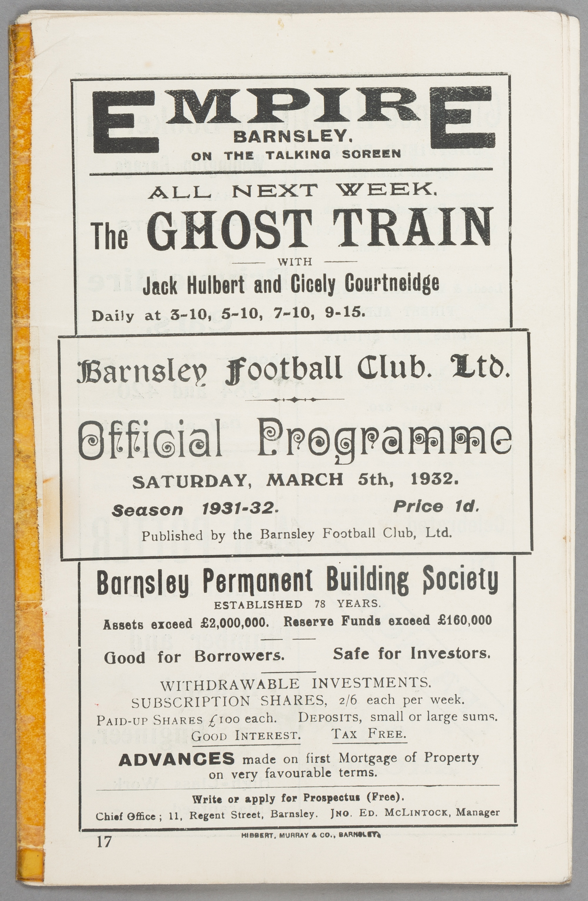 Barnsley v Bradford Park Avenue programme 5th March 1932, F.L. Division Two fixture