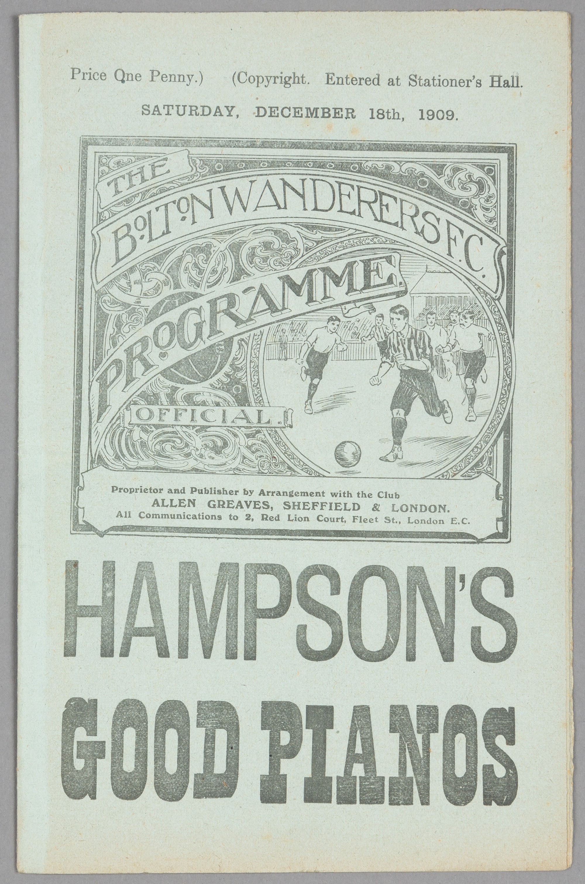 Bolton Wanderers v Preston North End programme 18th December 1909, F.L. Division One fixture