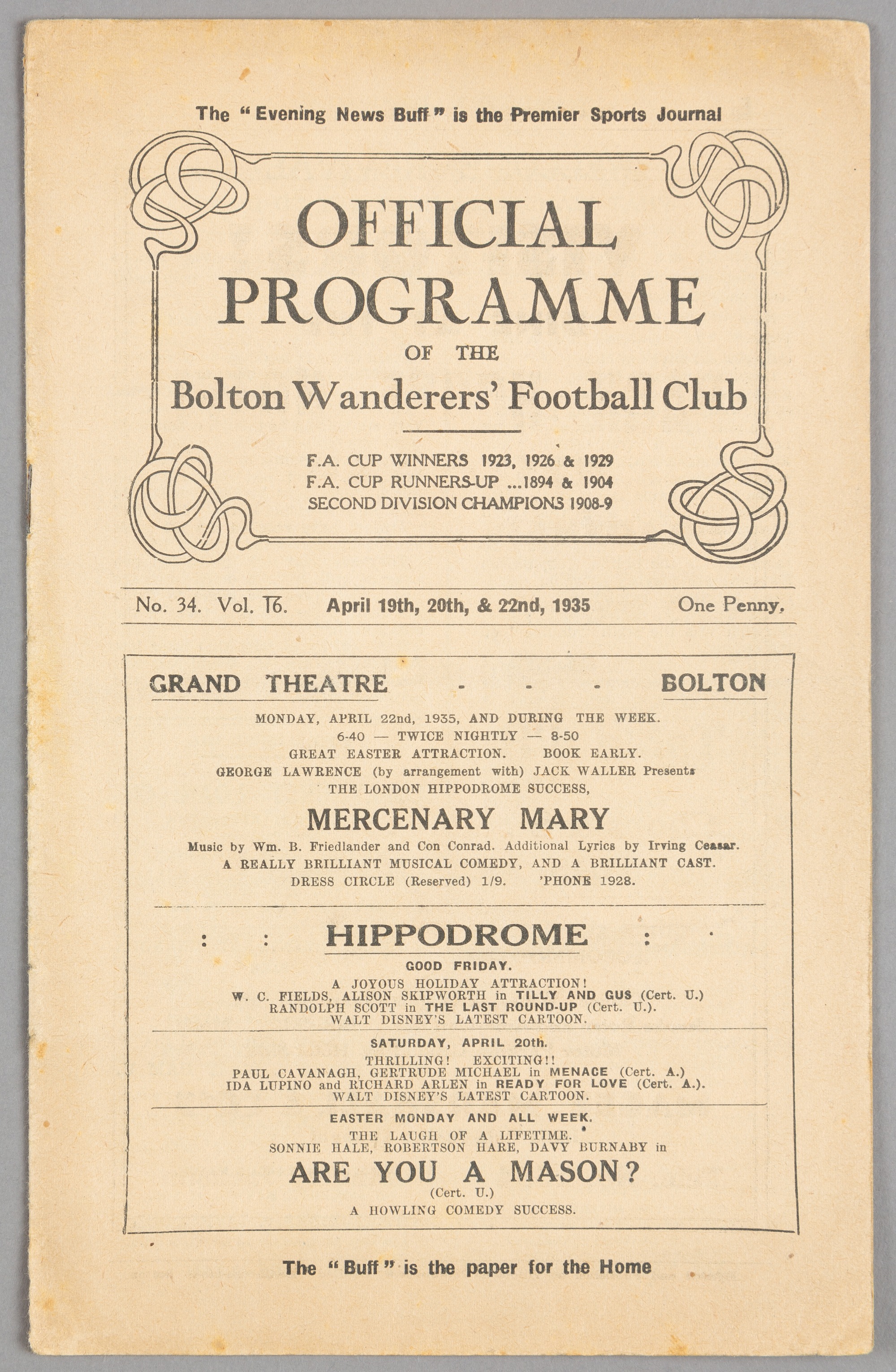 Bolton Wanderers home programme for Easter 1935 including a reserves match v Manchester United, a combined issue for 19th, 20th & 22nd April covering