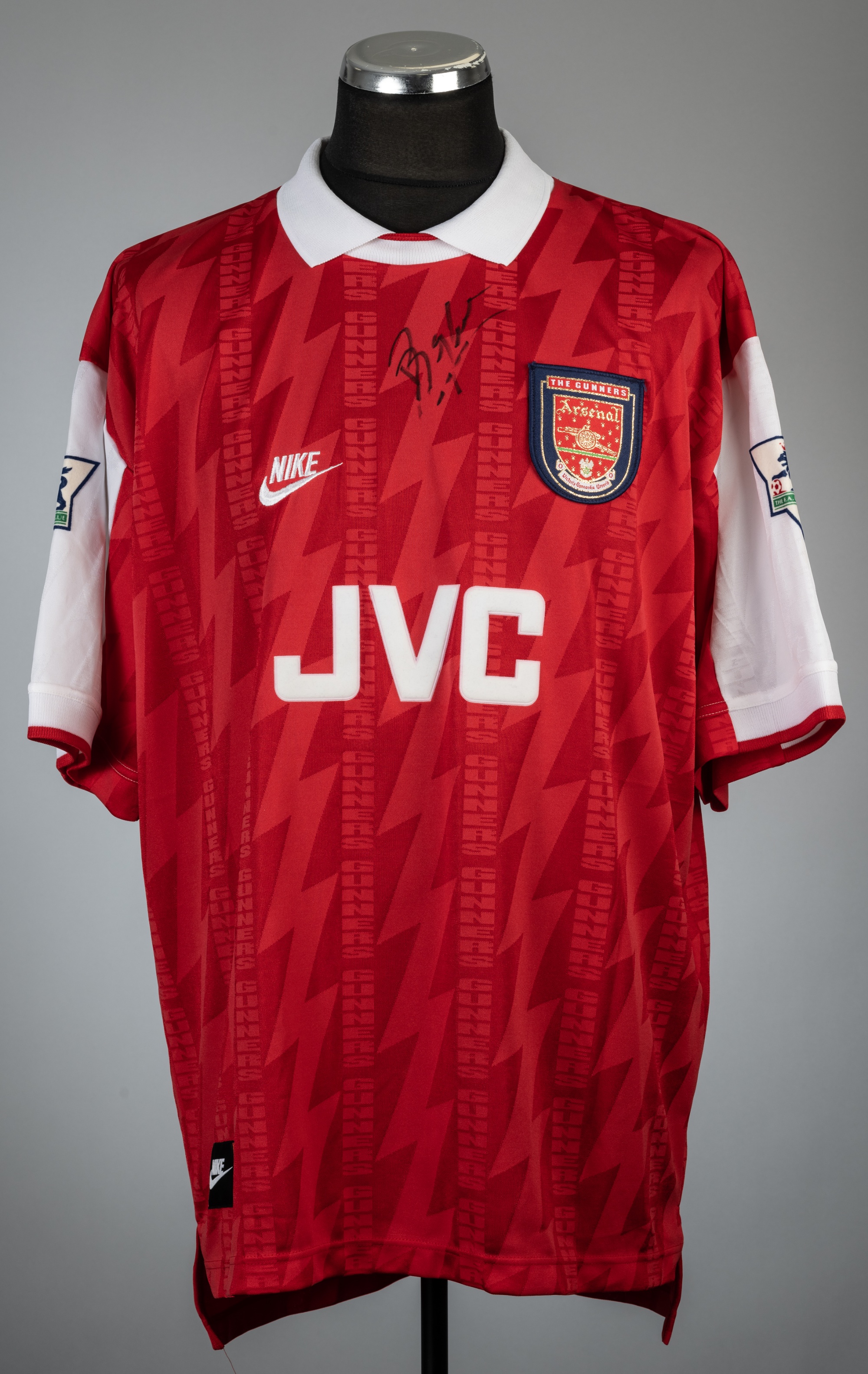 Dennis Bergkamp signed red Arsenal no.10 home jersey, season 1995-96, Nike, short-sleeved with THE FA PREMIER LEAGUE sleeve badges, club crest and sponsor logo, reverse lettered BERGKAMP, signed in black marker pen to front, size XXL