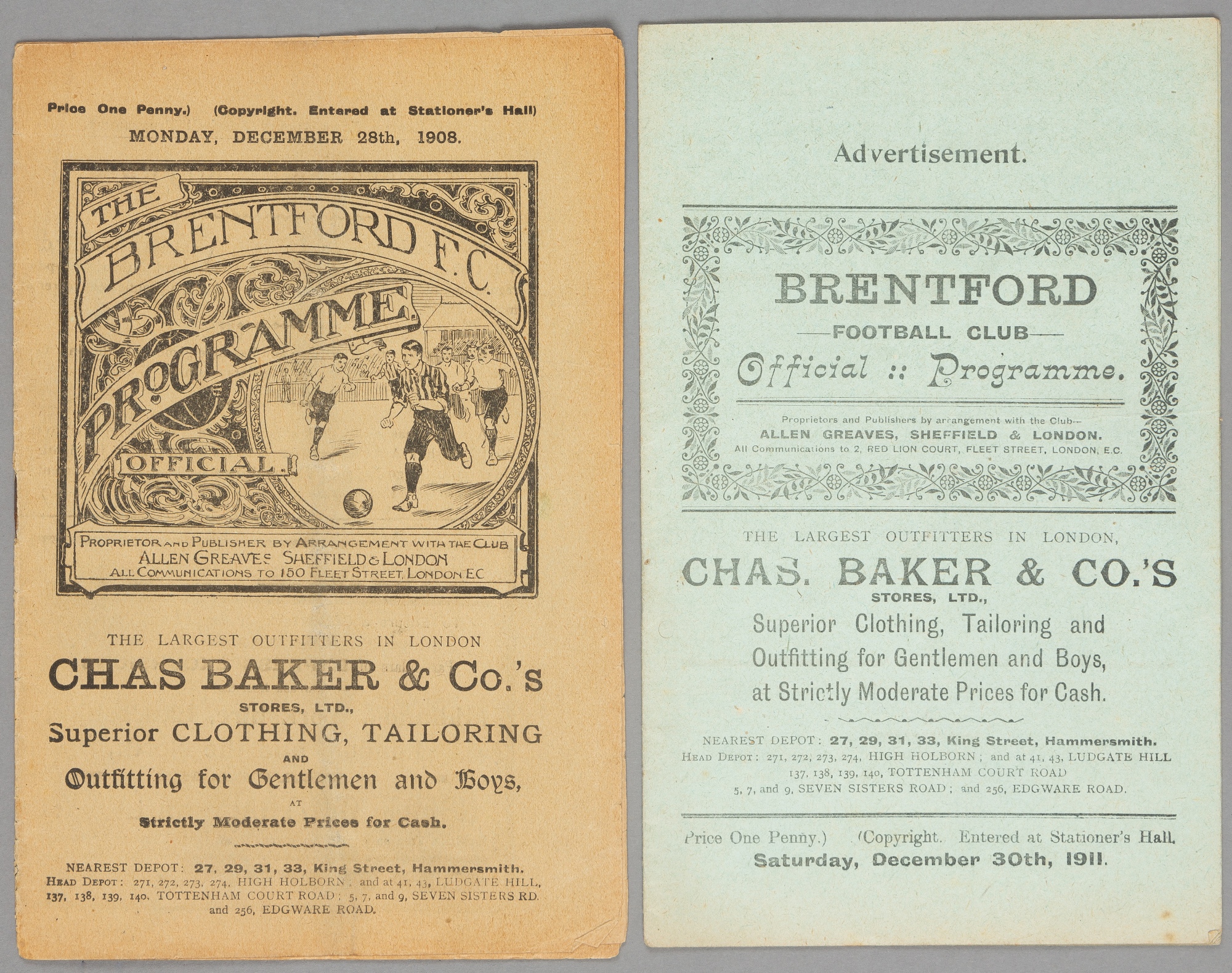 Two Brentford v Reading programmes, Southern F.L. Division One fixtures, 28th December 1908 and 30th December 1911, (2), wear to both, splits and tea