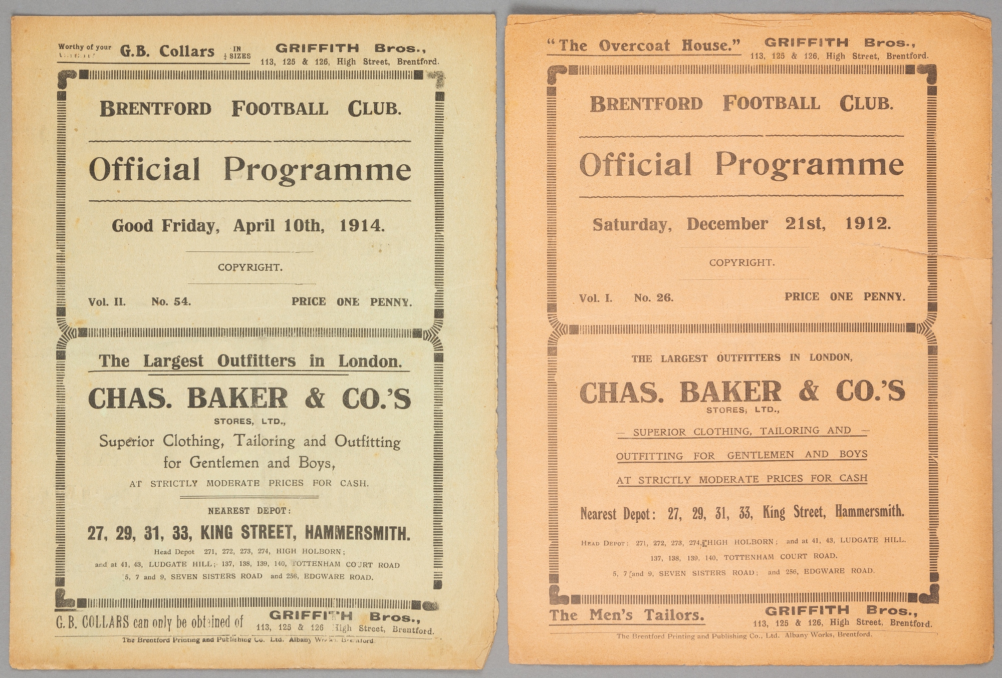 Two Brentford programmes v Welsh opposition, Southern League Division One fixture v Merthyr Town 21st December 1912 and the Division Two match v Aberdare Athletic 10th April 1914, (2), wear to both spines, fragile, some paper loss, tear to one front page edge inwards, no staples, discolouration, page edge paper losses