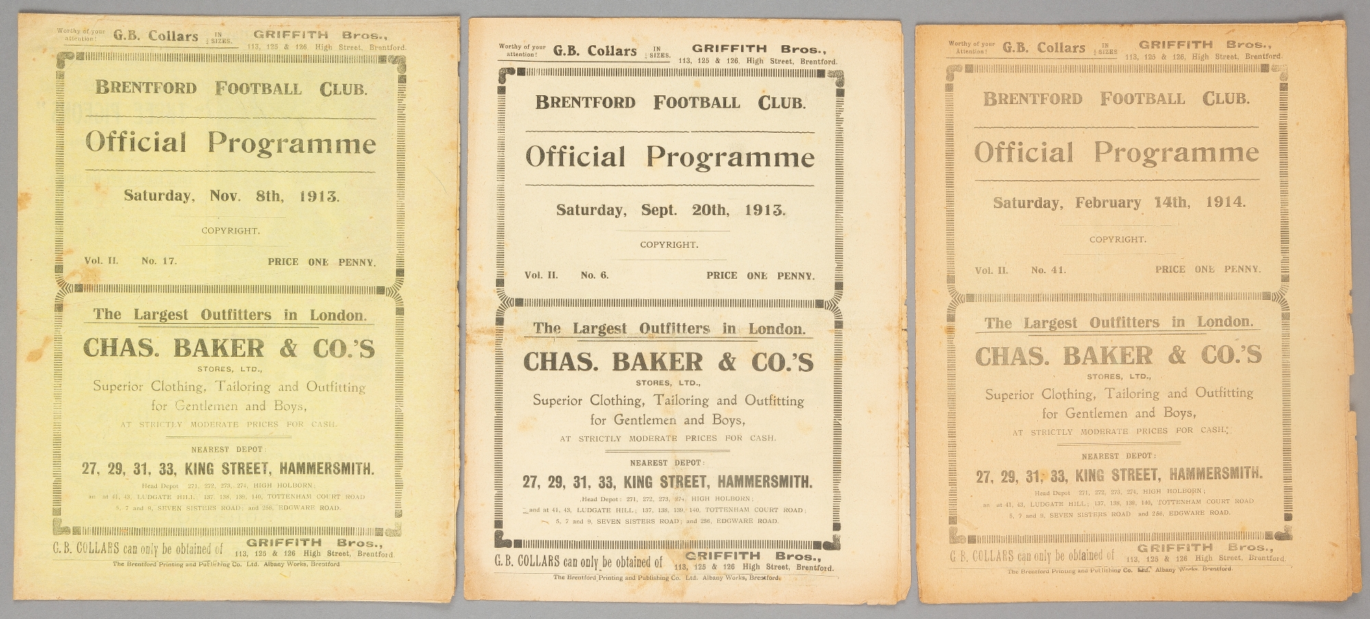 Three Brentford Southern F.L. Division Two home programmes v Welsh opposition in season 1913-14, v Caerphilly 20th September, Mardy 8th November and
