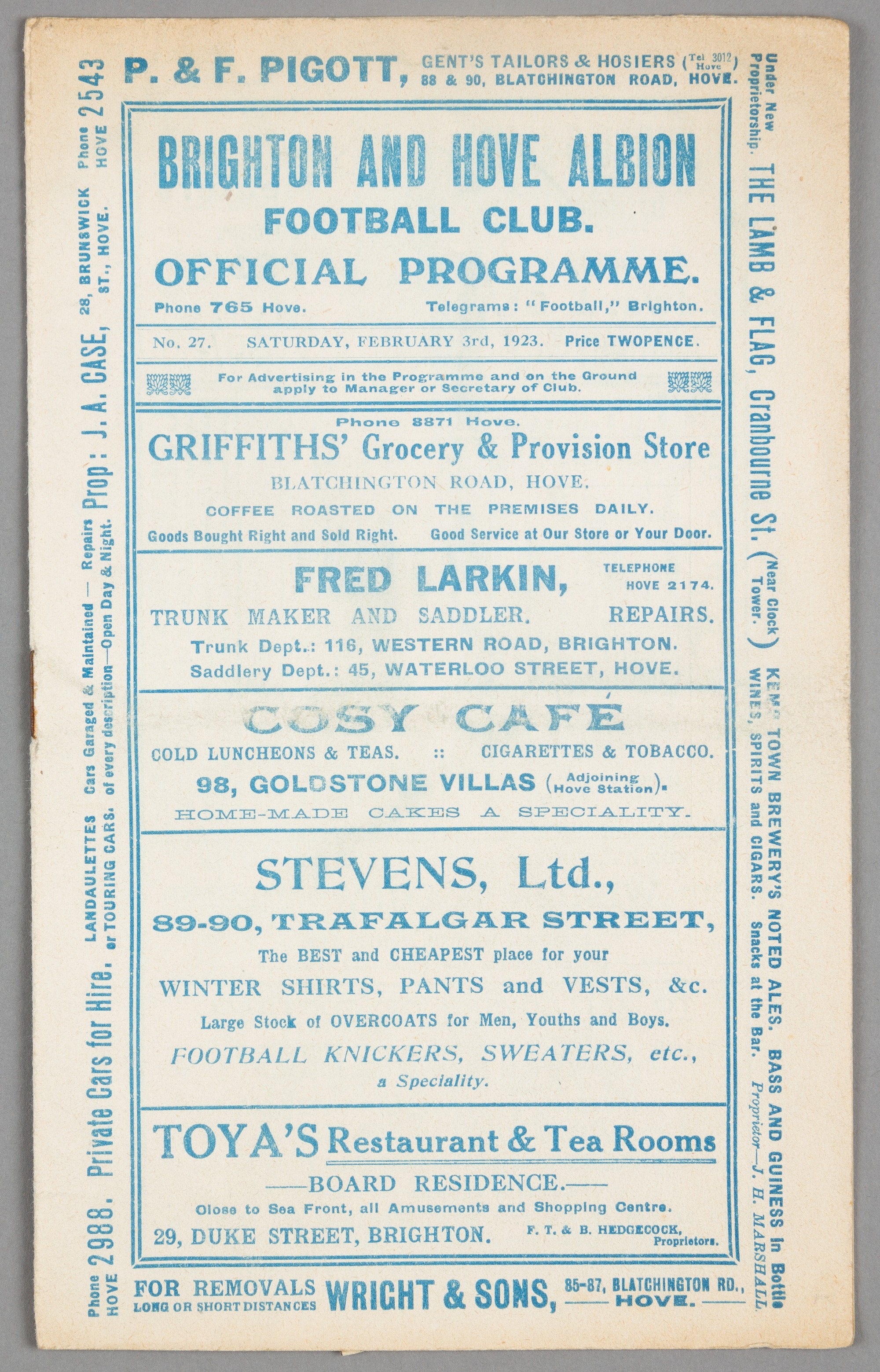 Brighton and Hove Albion v West Ham United programme 3rd February 1923, 2nd Round F.A. Cup tie from 'The Hammers' 1923 Cup run to the first final at