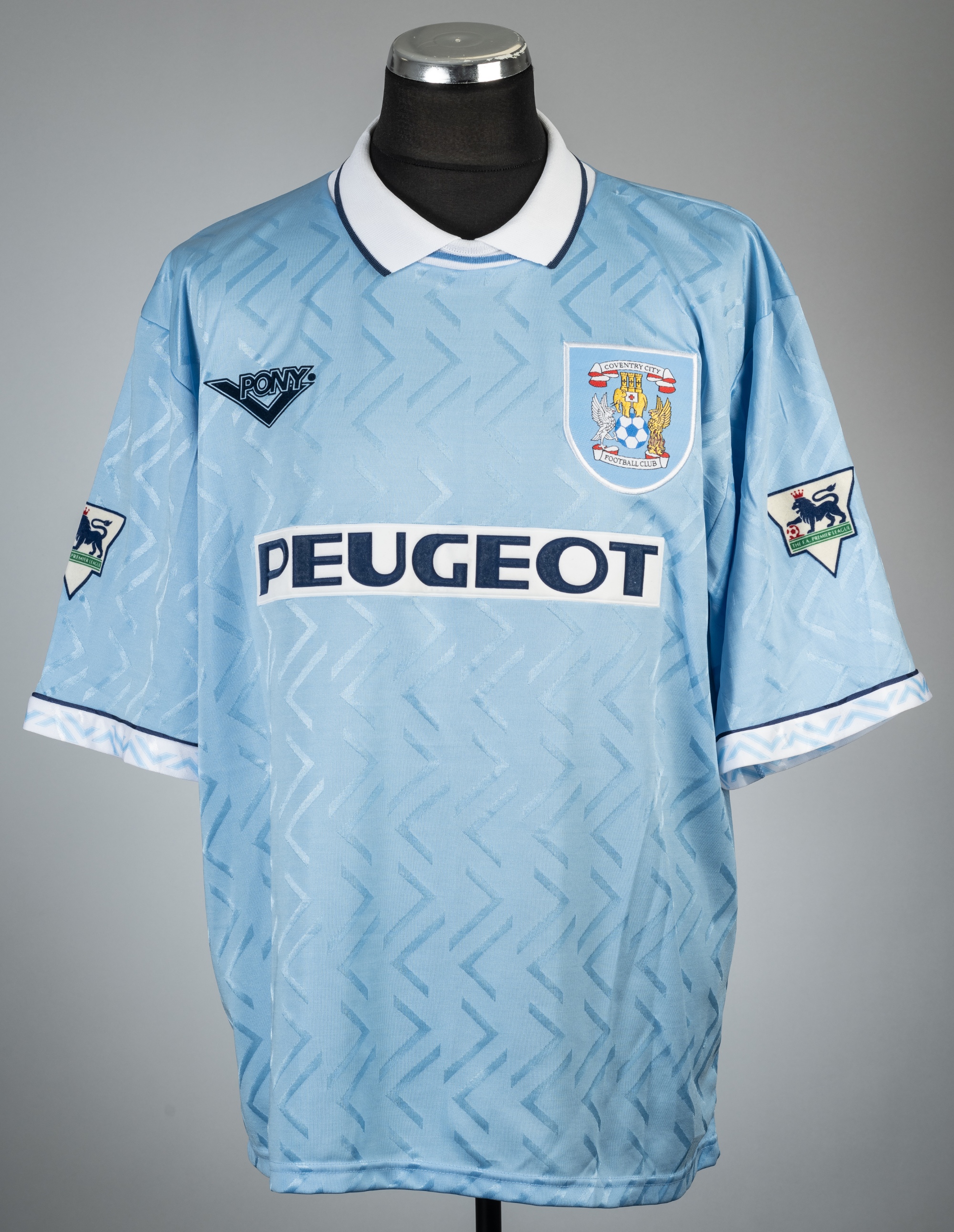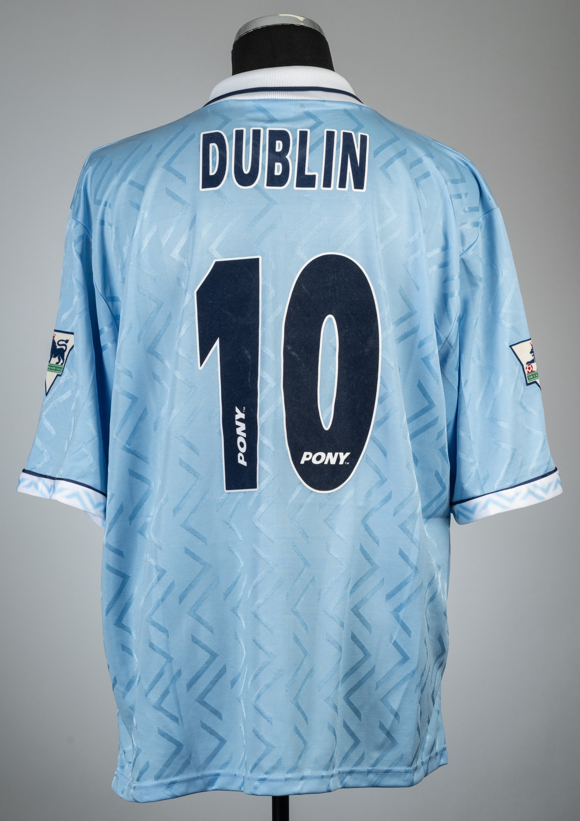 Dion Dublin blue Coventry City no.10 home jersey, season 1995-96, Pony, short-sleeved with THE FA PREMIER LEAGUE sleeve badges, club crest and sponsor logo, reverse lettered DUBLIN, size XXL 48/50in.