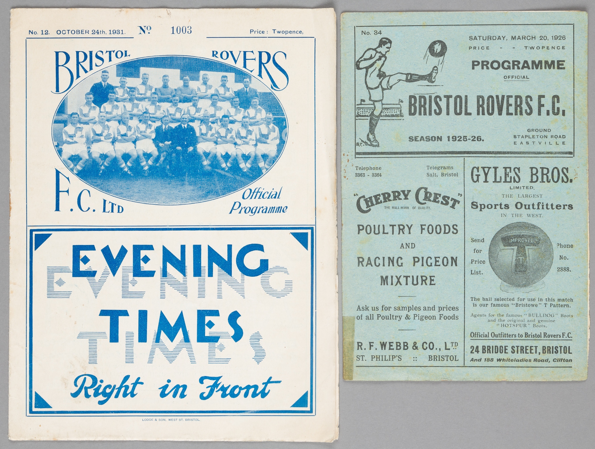 Two Bristol Rovers home programmes, FL Division Three (South) fixtures v Bristol City 20th March 1926 and Exeter City 24th October 1931
