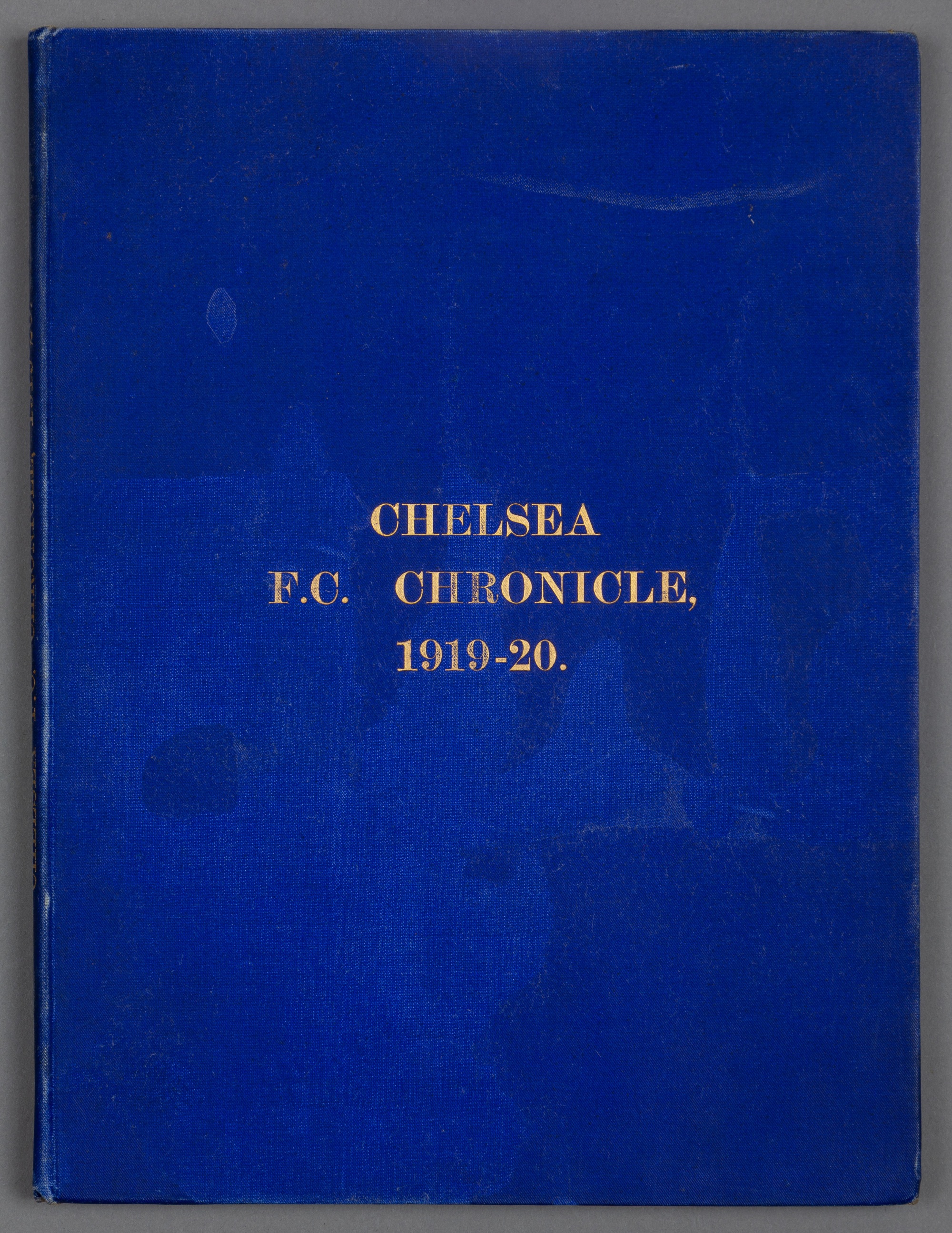 Bound volume of Chelsea home programmes season 1919-20, THE VOLUME INCLUDING THE 1920 F.A. CUP S/F BRISTOL CITY v HUDDERSFIELD TOWN, comprising first team (Football League Div 1) and reserves (London Football Combination), plus London Professional Charity Fund match v Fulham 27th Oct, London Cup S/F Fulham v Crystal Palace 10th Nov, FA Cup replay Swansea Town v Gillingham 5th Jan s/s, FA Cup 2nd Rd v Swindon Town 31st Jan, FA Cup 4th Rd v Bradford Park Ave 6th March, Corinthians v Queens Park (Glasgow) 15th March s/s, No. 35 including photographic insert of HM The King shaking hands with Chelsea’s captain with the Chairman looking on, Fred Taylor Benefit match v Brentford 14th April s/s, blue cloth-covered boards, gilt titling, good condition throughout. Provenance: Jack Budd, Chelsea FC Club Director 1931 to 1952.
