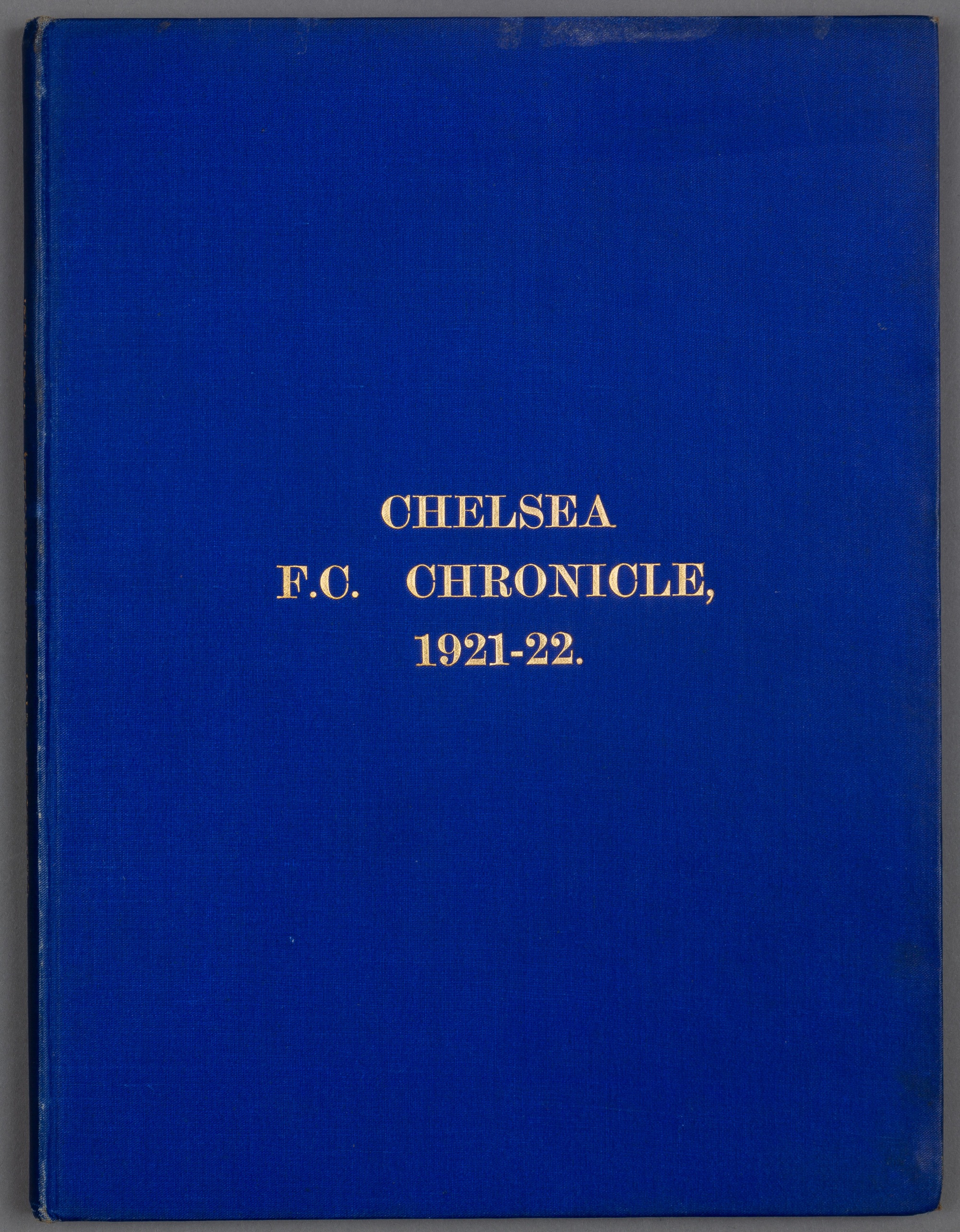 Bound volume of Chelsea home programmes season 1921-22, comprising first team (Football League Div 1) and reserves (London Football Combination), plus London Professional Charity Fund match v Fulham 26th Sept s/s, London Challenge Cup 1st Rd v Millwall 17th Oct s/s, Amateurs v Professionals 7th Nov s/s, London Challenge Cup S/F Tottenham v Arsenal 14th Nov s/s, London Challenge Cup S/F replay Fulham v Crystal Palace 21st Nov s/s, friendly v Oxford & Cambridge Universities 15th Dec s/s, FA Cup 1st Rd v WBA 7th Jan, friendly v Everton 28th Jan, Corinthians v Preston North End 6th Feb s/s, friendly v Fulham 18th Feb, blue cloth-covered boards, gilt titling, very good, minor marks to front board, interior very good. Provenance: Jack Budd, Chelsea FC Club Director 1931 to 1952.