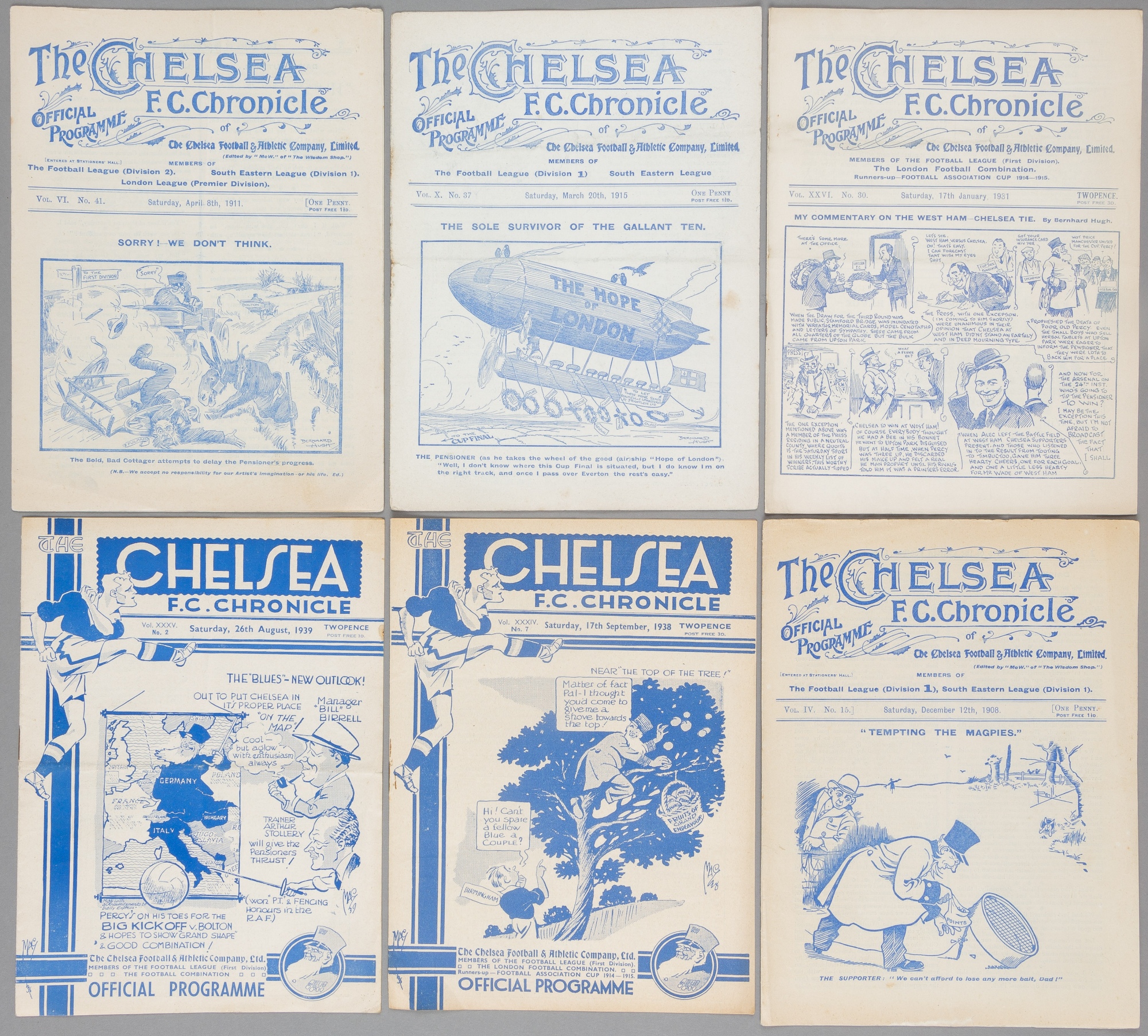 Six Chelsea home programmes, v Newcastle United 12th December 1908, Fulham 8th April 1911, Blackburn Rovers 20th March 1915, West Ham United 17th January 1931, Birmingham 17th September 1938 and Bolton Wanderers 26th August 1939