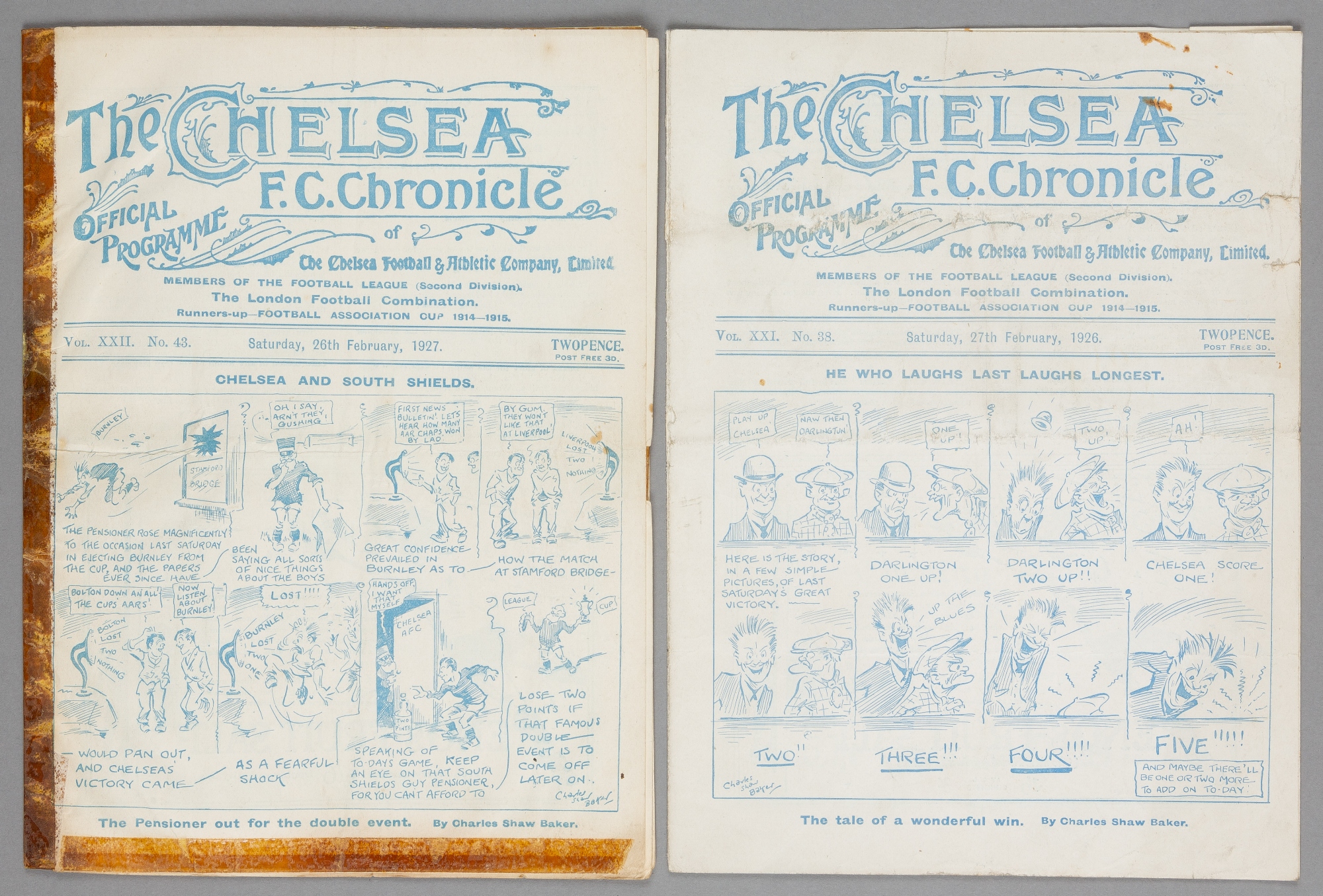 Two Chelsea v South Shields programmes, F.L. Division Two fixtures, 27th February 1926 and 26th February 1927 (the 1927 poor), (2)