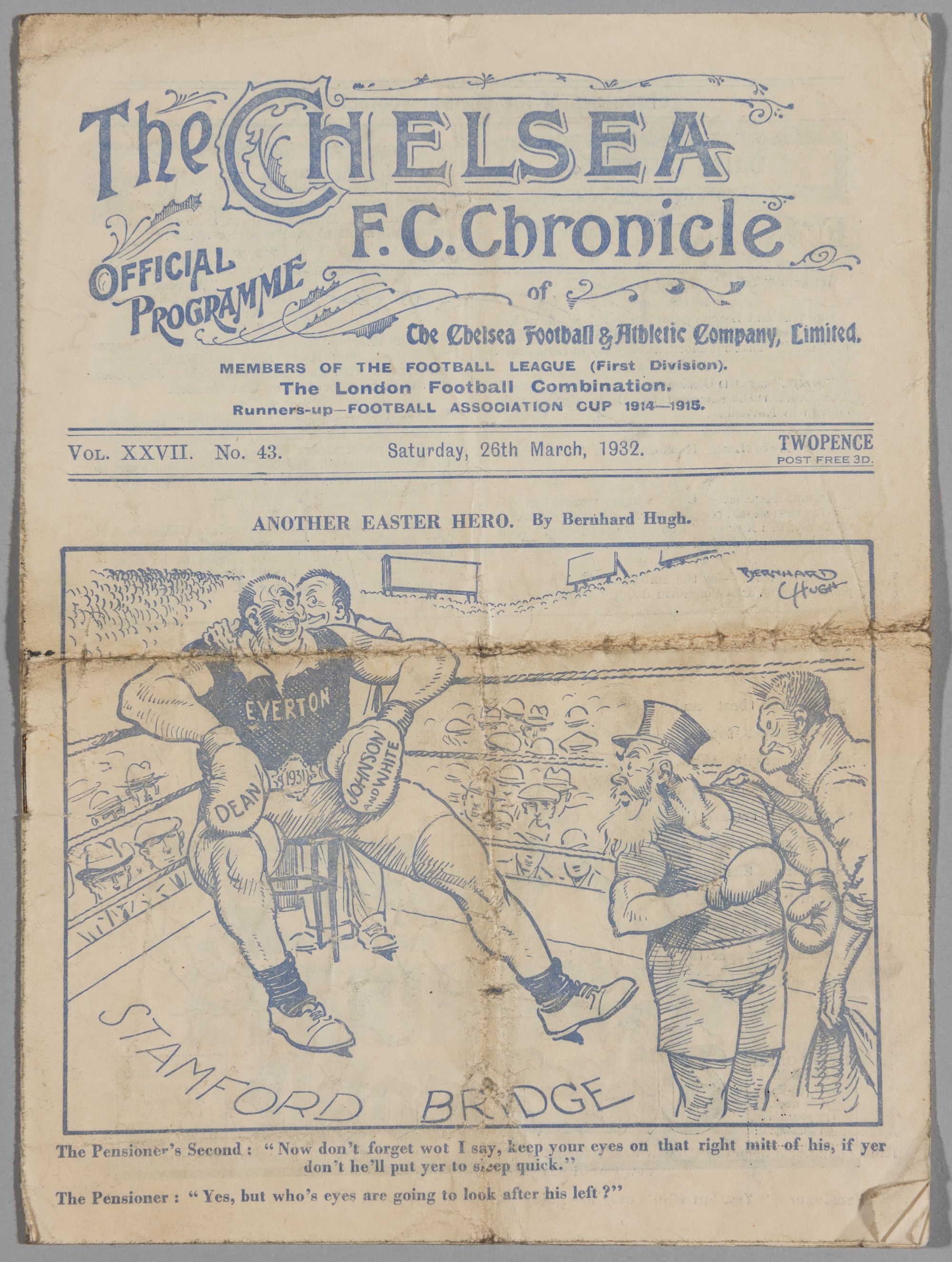 Chelsea team-signed programme for the Everton match played at Stamford Bridge, 26th March 1932, 8 pages, bears wear throughout, horizontal and vertical folds, wear to page and spine edges, bears written annotations This fixture resulted in a 0-0 draw.