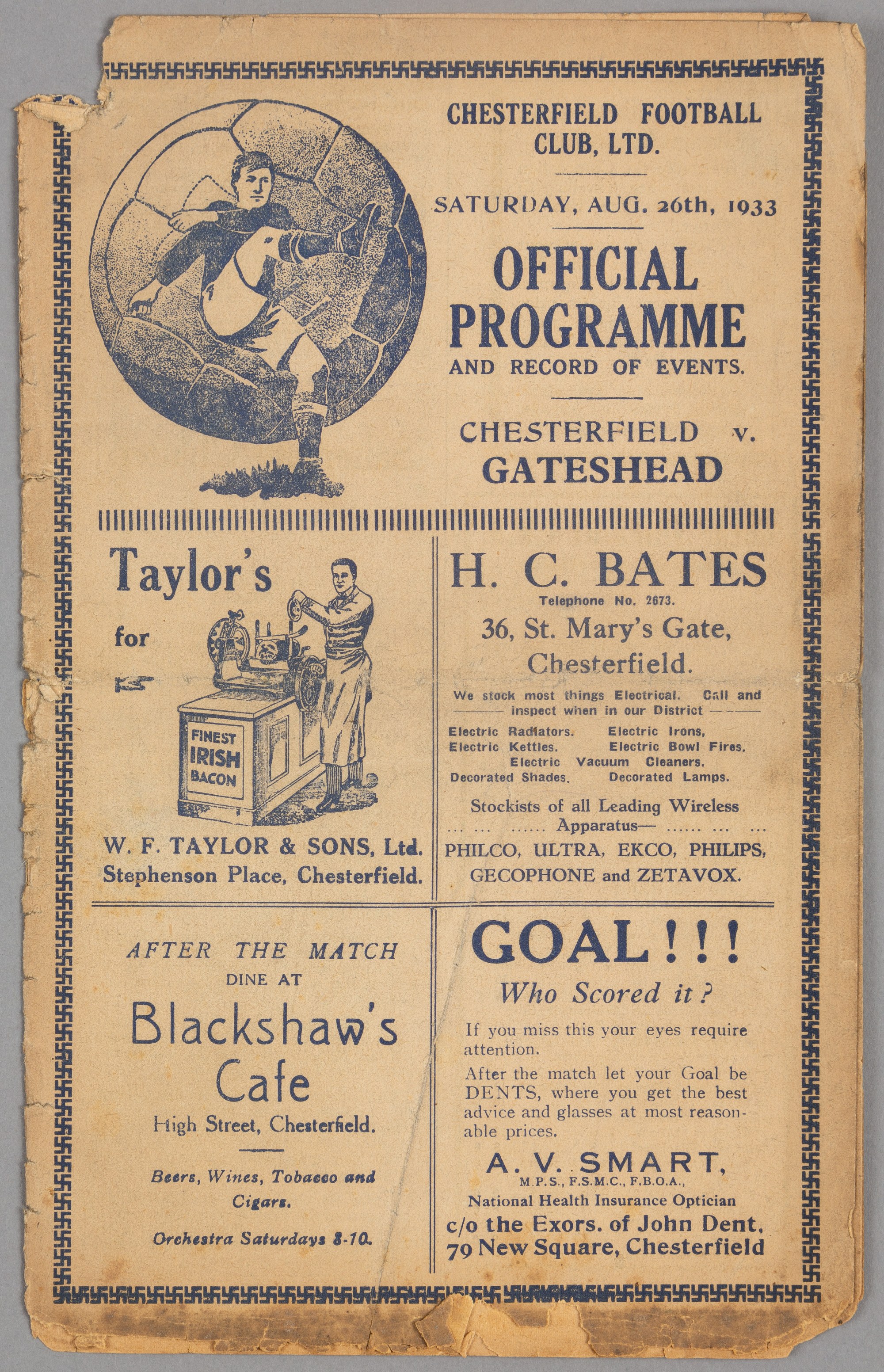Chesterfield v Gateshead programme 26th August 1933, F.L. Division Three North fixture, paper loss