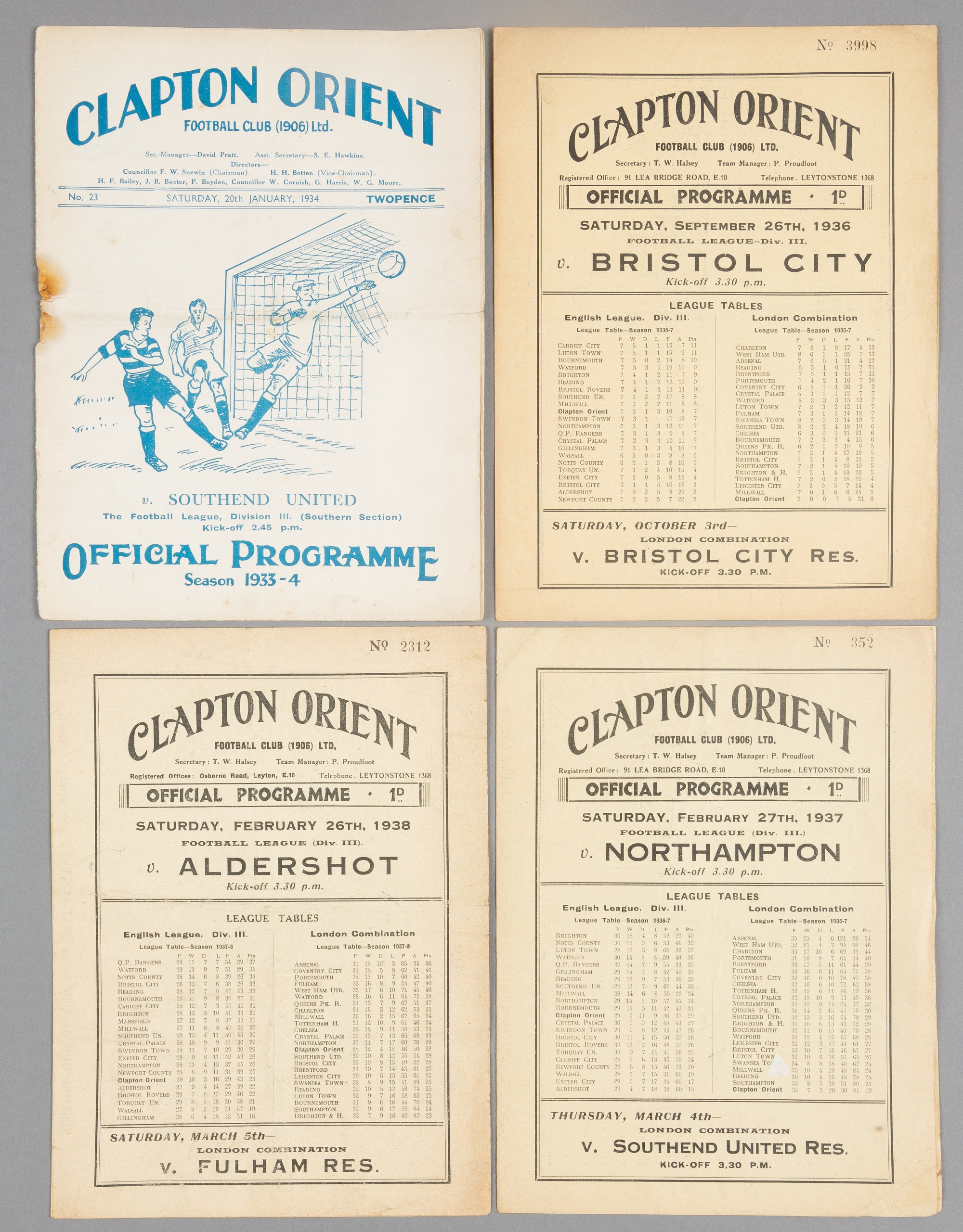 11 Clapton Orient 1930s home programmes, FL Division Three (South) fixtures v Southend United 20th January 1934, Northampton Town 5th October 1935, Bristol City 26th September 1936, Torquay United 6th February 1937, Northampton Town 27th February 1937, Aldershot 27th March 1937, Southend United 22nd October 1938, Torquay United 12th February 1938, Aldershot 26th February 1938, Bristol Rovers 5th November 1938 and Mansfield Town 3rd December 1938, (11), fair condition, each with wear and some with creases and folds, white example bears rust and holes near staple, one with horizontal tear on upper section seen from front