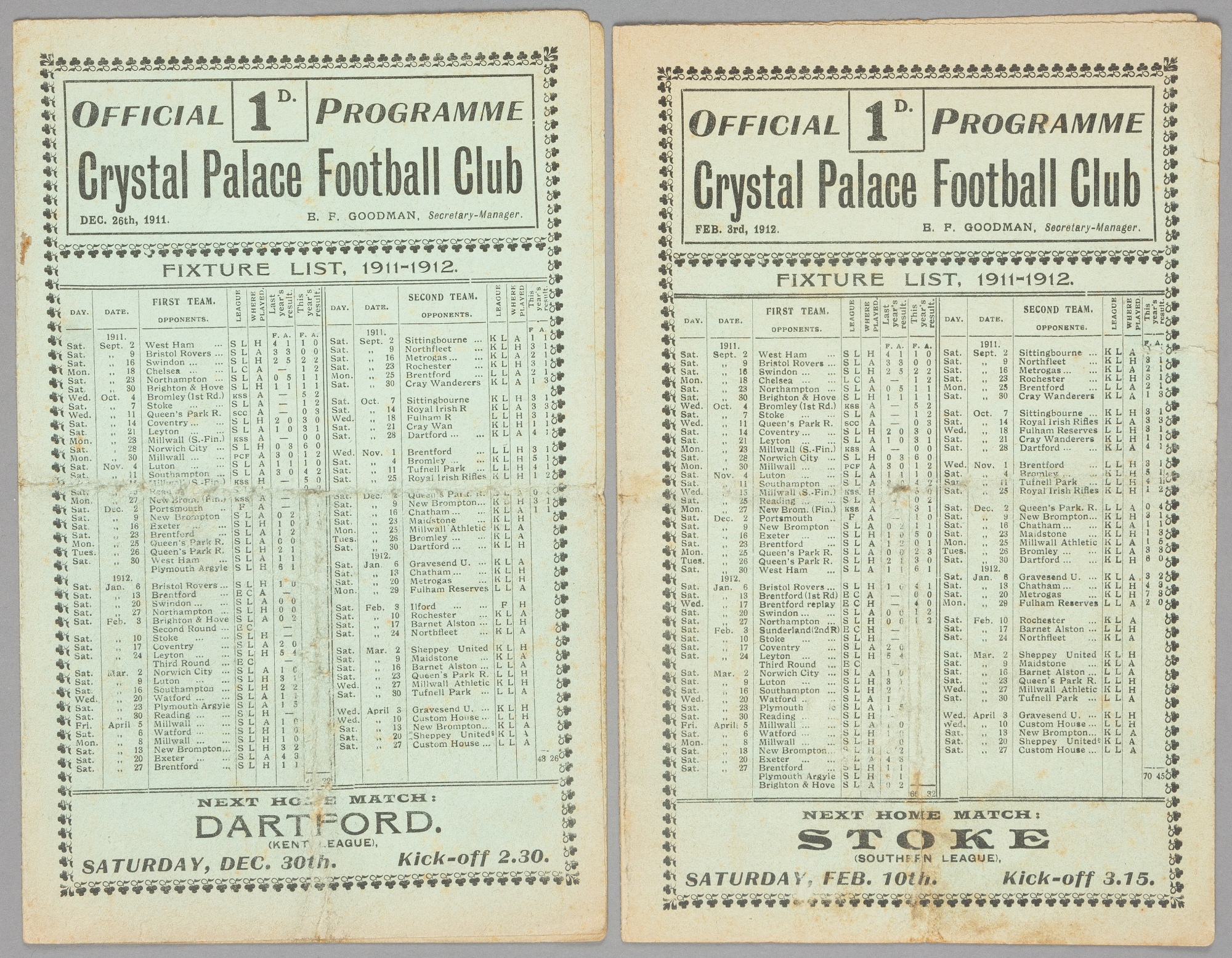 Two Crystal Palace home programmes, Southern F.L. Division One fixture v QPR 26th December 1911 and a F.A. Cup 2nd Round tie v Sunderland 3rd February 1912, (2)