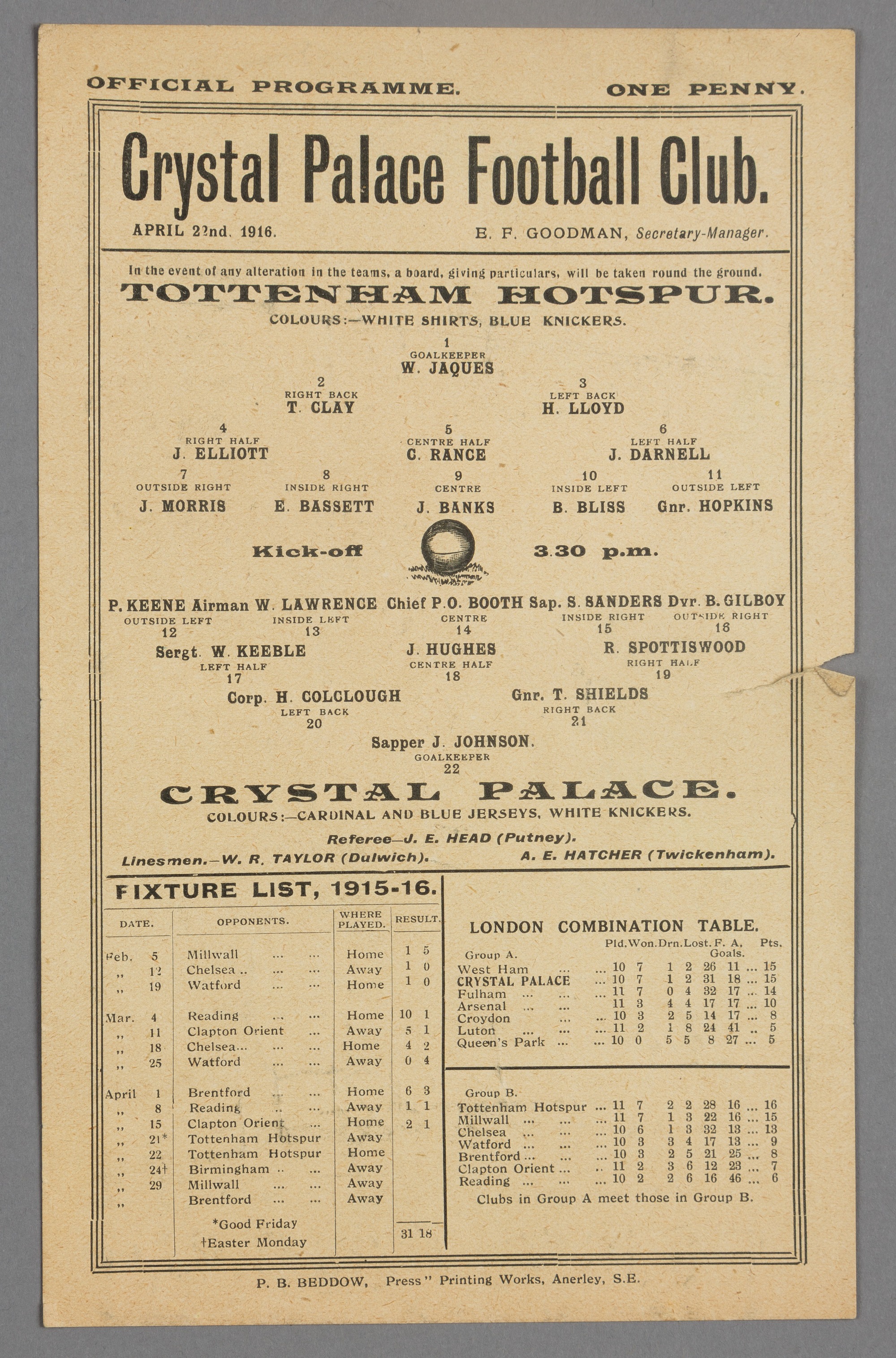Crystal Palace v Tottenham Hotspur programme, 22nd April 1916, single-sheet printed on one side, with team line-up and fixture list for 1915-16, bear