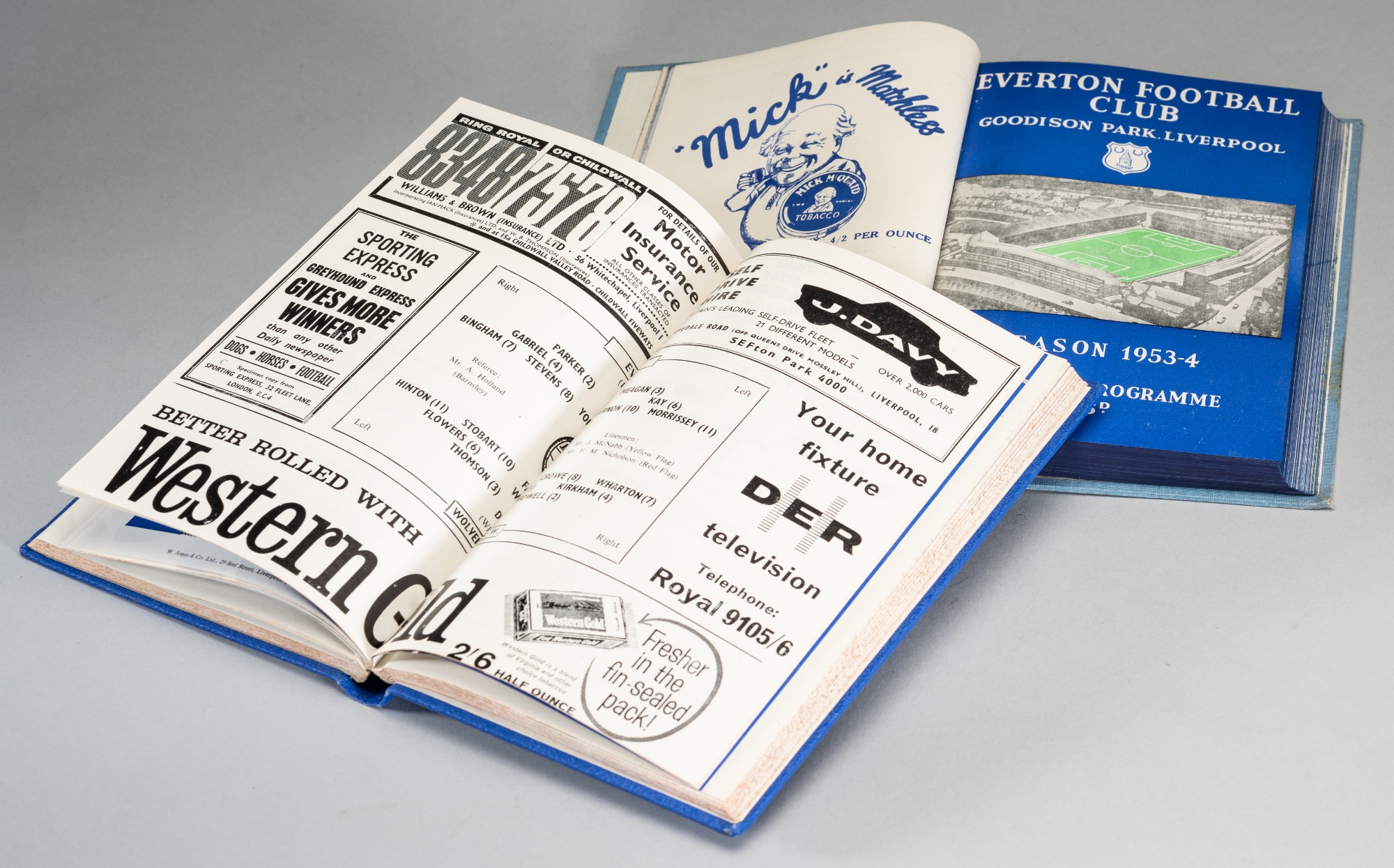 Two bound volumes of Everton FC home programmes seasons 1953-54 (THE CLUB’S PROMOTION SEASON) and 1962-63 (DIV 1 CHAMPIONSHIP SEASON), both volumes with covers preserved, the earlier with League Division 2 and Central League issues plus two practice matches and representative match England v Rep of Ireland 11th Nov, the later volume with first team (Div 1) fixtures only, bound in blue cloth-covered board, gold titling to spine, both good condition, (2)