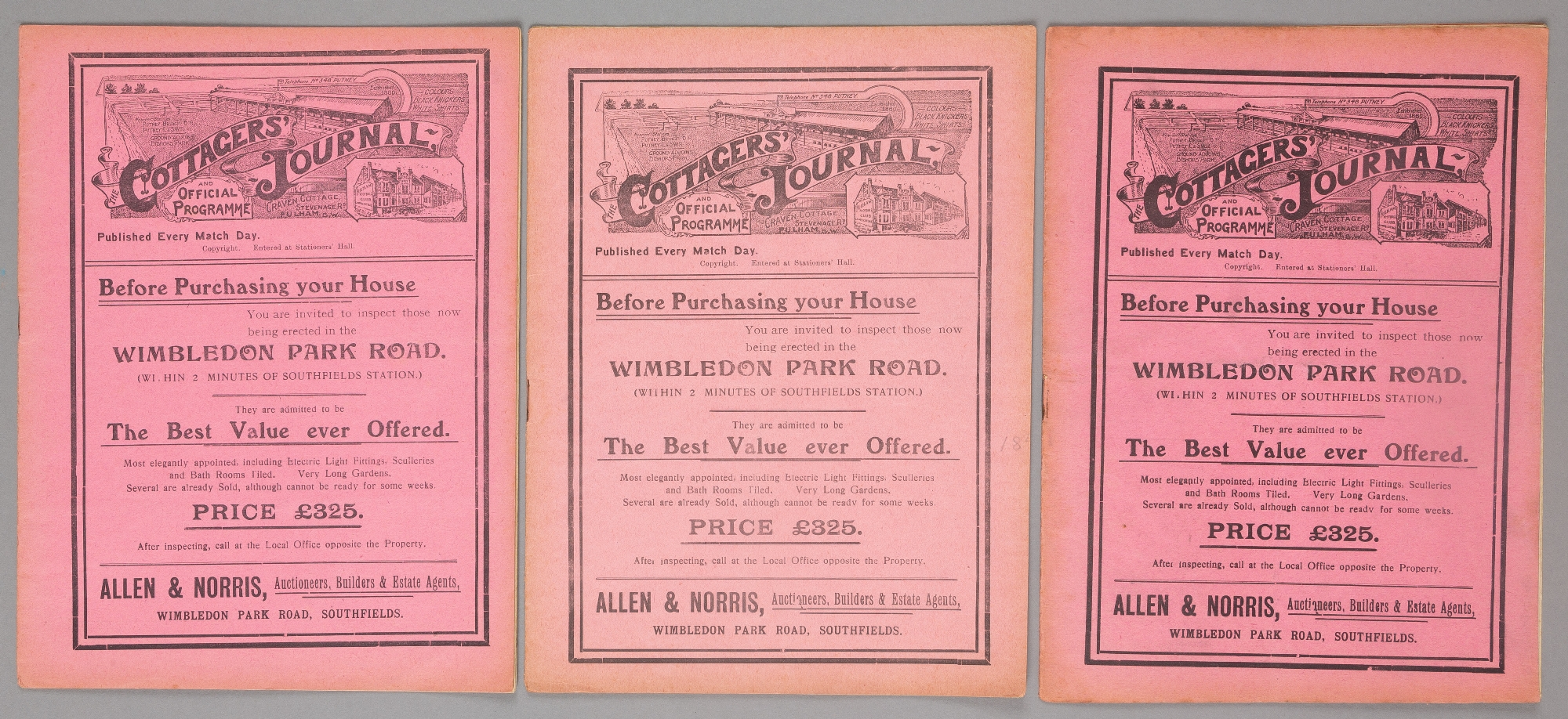 Three Fulham home programmes season 1910-11, F.L. Division Two fixtures v Huddersfield Town 26th December, WBA 7th January and Barnsley 18th March, (3)