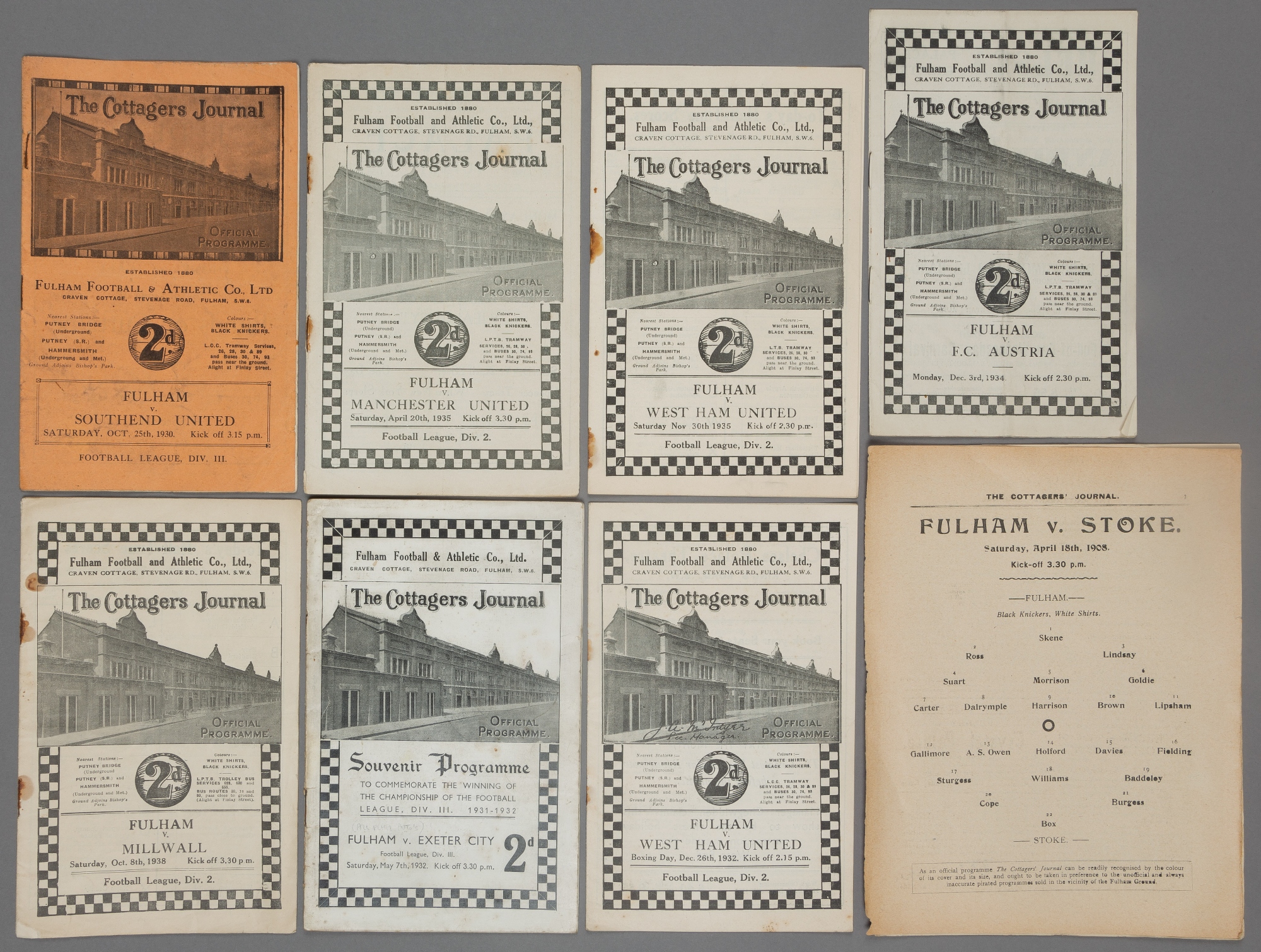 Eight Fulham home programmes dating between 1922 and 1938, F.L. Division Two fixtures v Port Vale 2nd September 1922, West Ham United 26th December 1932 and 30th November 1935, Manchester United 20th April 1935 and Millwall 8th October 1938; F.L. Division Three (South) matches v Southend United 25th October 1930 and Exeter City 7th May 1932, this being a special souvenir edition to commemorate the League winning season; and the friendly v F.C. Austria 3rd December 1934; the lot also including the team line-ups page only from the home programme v Stoke 18th April 1908 (9)