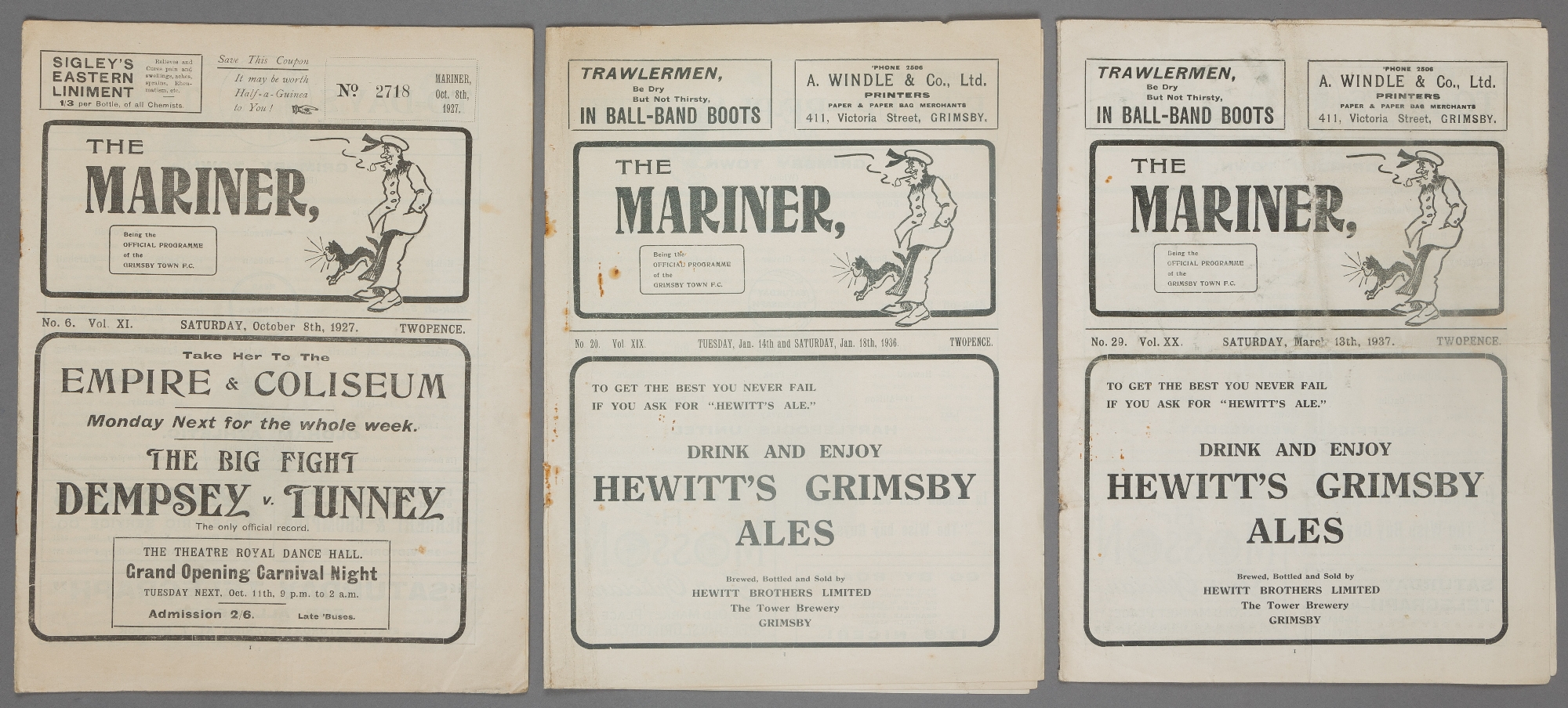 Three Grimsby Town home programmes, F.L. Division Two v Oldham Athletic 8th October 1927; a combined programme for the FAC3 replay v Hartlepools United 14th January 1936 and the F.L. Division One match v Liverpool 18th January 1936; and F.L. Division One v Sheffield Wednesday 13th March 1937 F.L. Division Two fixture v F.L. Division Two fixture v