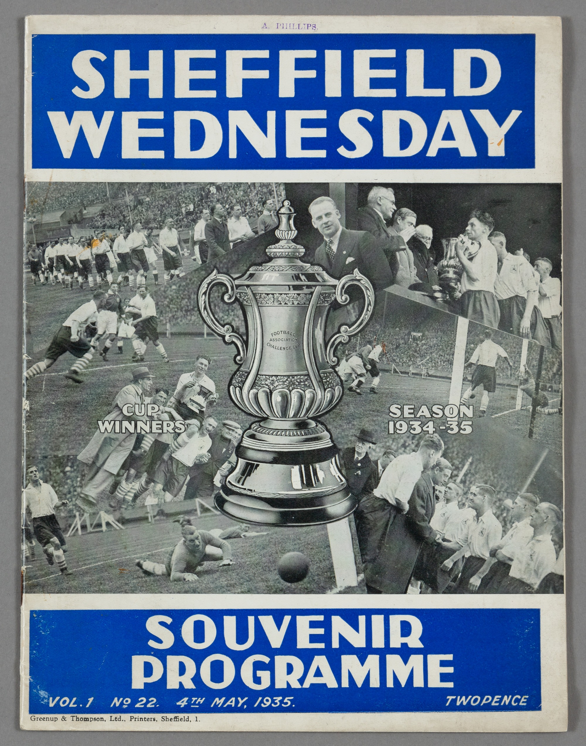 Grimsby Town v Bradford Park Avenue programme 14th April 1933, F.L. Division Two fixture, a combined programme also covering reserves v Wombwell; sold together with a Grimsby away at Sheffield Wednesday 4th May 1935, this being the last F.L. Division One match of the season and also acting as a souvenir edition for Wednesday’s 1934-35 F.A. Cup winning season, (2)