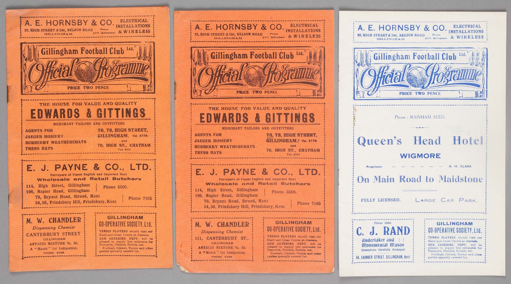 Three Gillingham home programmes, v Bristol City 28th October 1933, Northampton Town 8th September 1934 and Swindon Town 27th November 1937, (3)