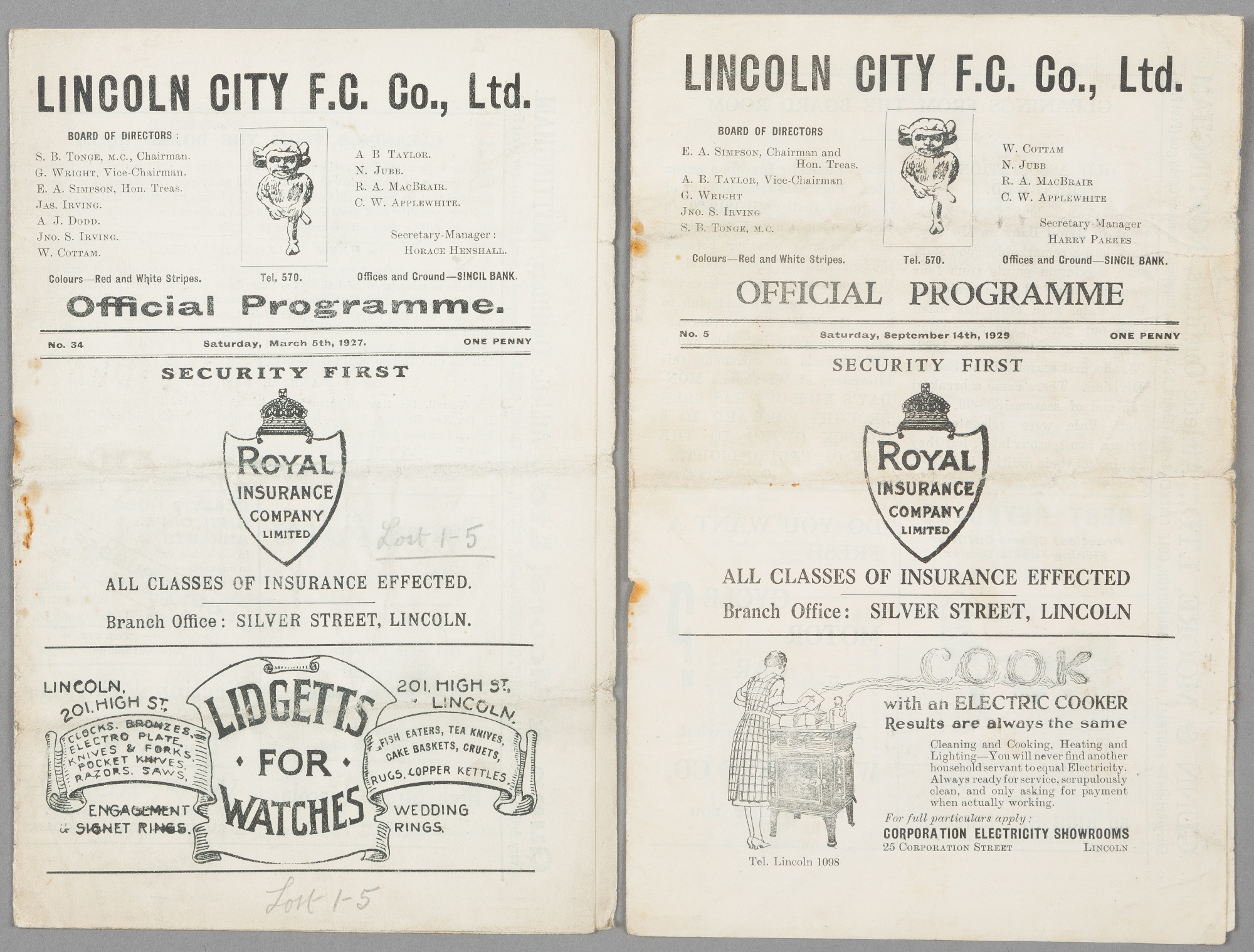 Two Lincoln City home programmes, F.L. Division Three North fixtures v Bradford Park Avenue 5th March 1927 and Accrington Stanley 14th September 1929, (2)