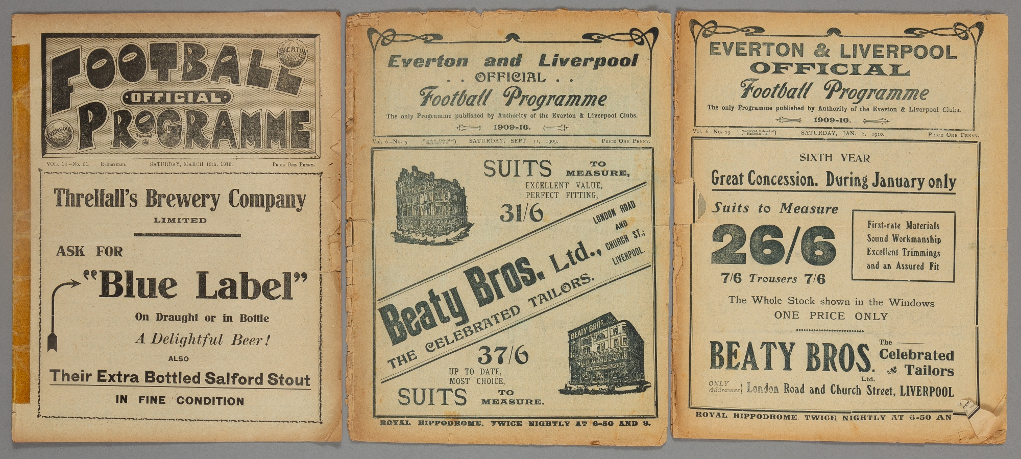 Three Liverpool home programmes dating between 1909 and 1915, F.L. Division One fixtures v Blackburn Rovers 11th September 1909, a combined programme also covering the Everton reserves fixture v Preston N.E.; Chelsea 8th January 1910, a combined programme also covering the Everton reserves fixture v St Helens Recs; and Manchester City 13th March 1915, a combined programme also covering the Everton reserves fixture v Blackburn Rovers