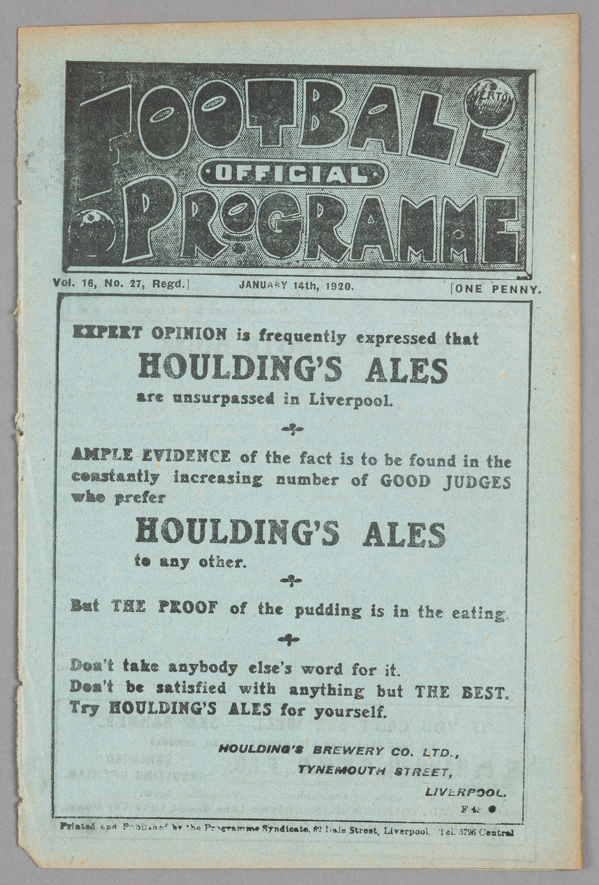 Liverpool v South Shields programme 14th January 1920, F.A. Cup First Round replay