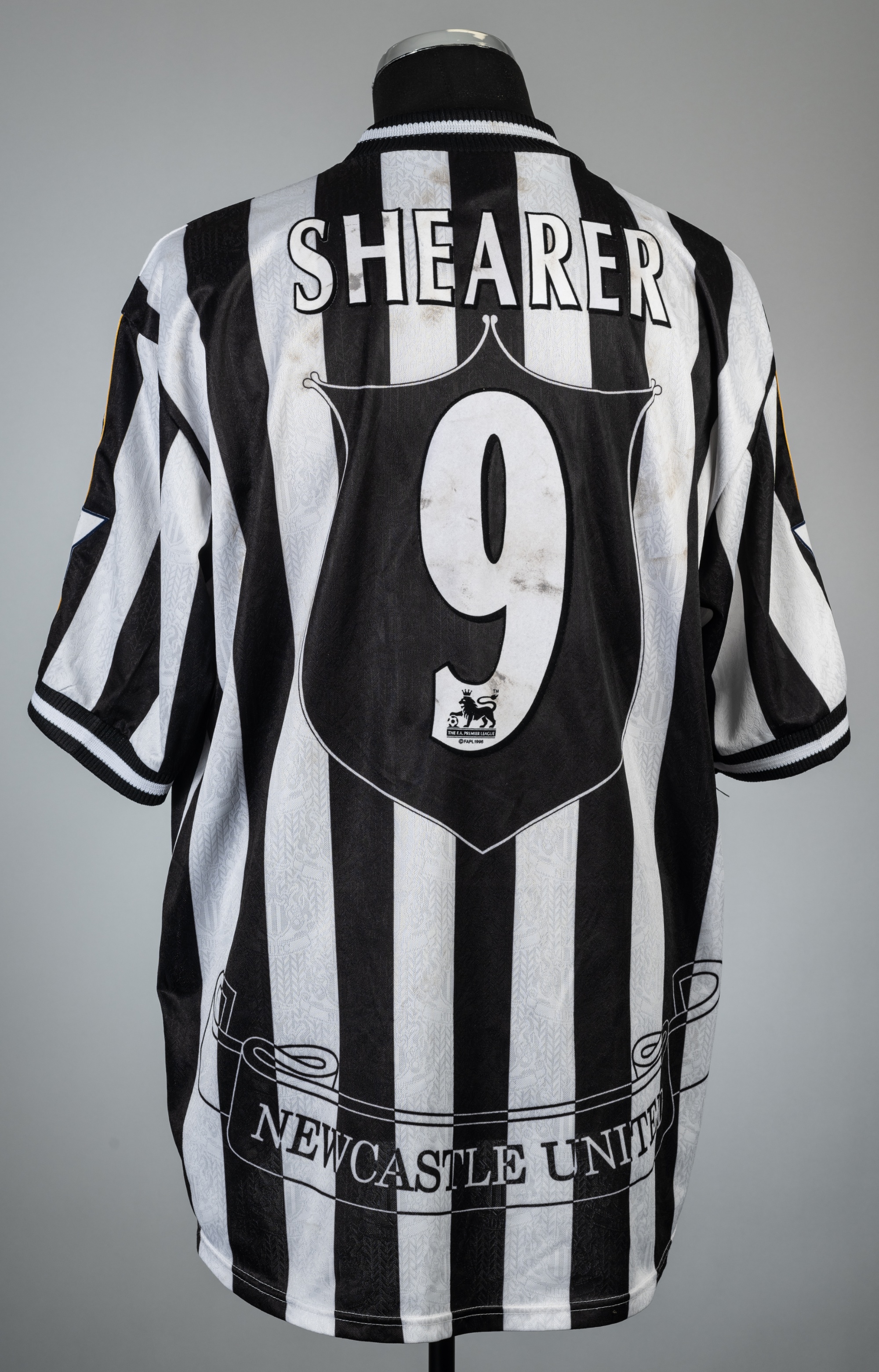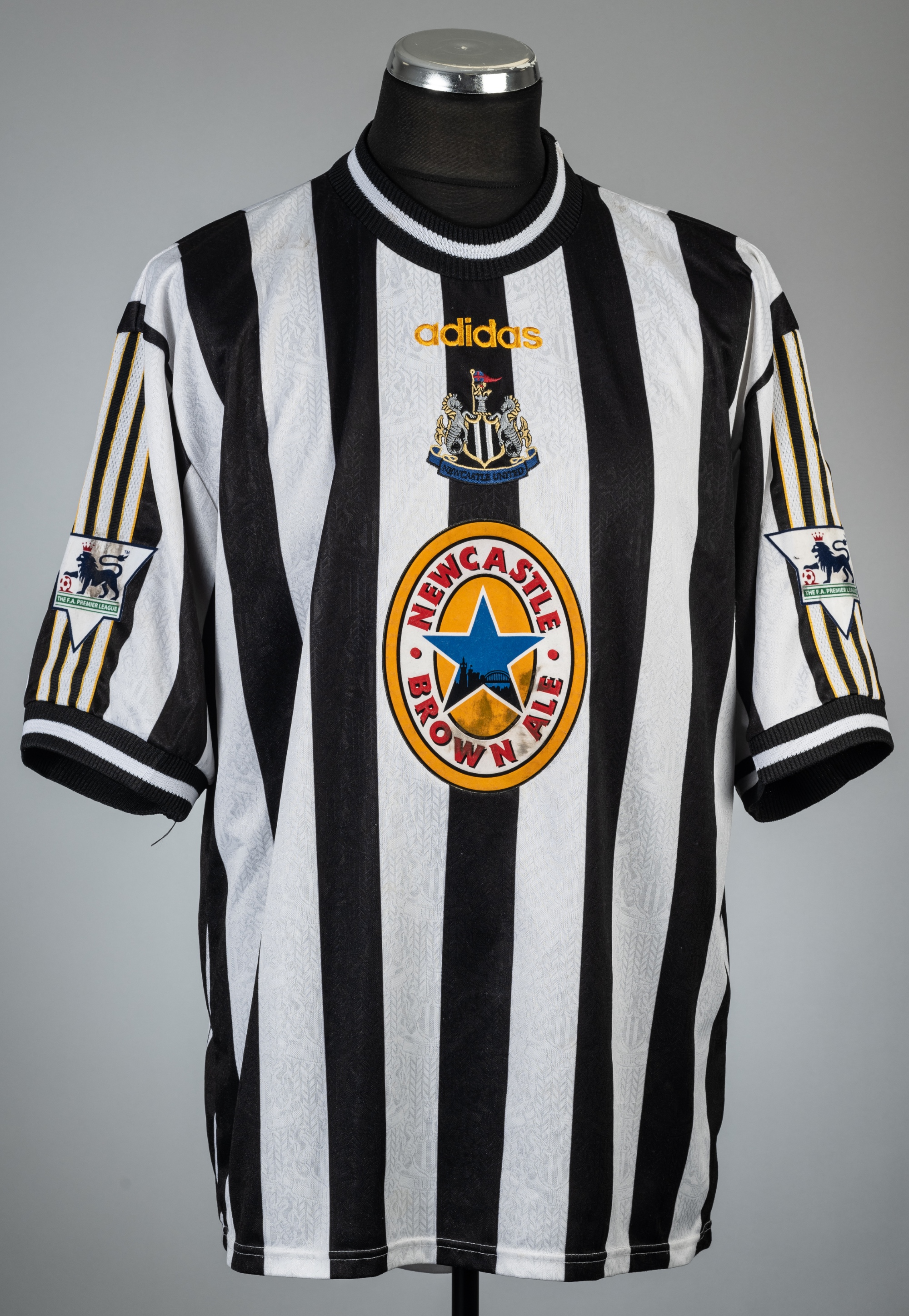 Alan Shearer black and white striped Newcastle United no.9 home jersey, season 1997-98, Adidas, short-sleeved with THE FA PREMIER LEAGUE sleeve badges, club crest and sponsor logo, reverse lettered SHEARER, size Xl, bears pitch wear, stains and marks on front and reverse
