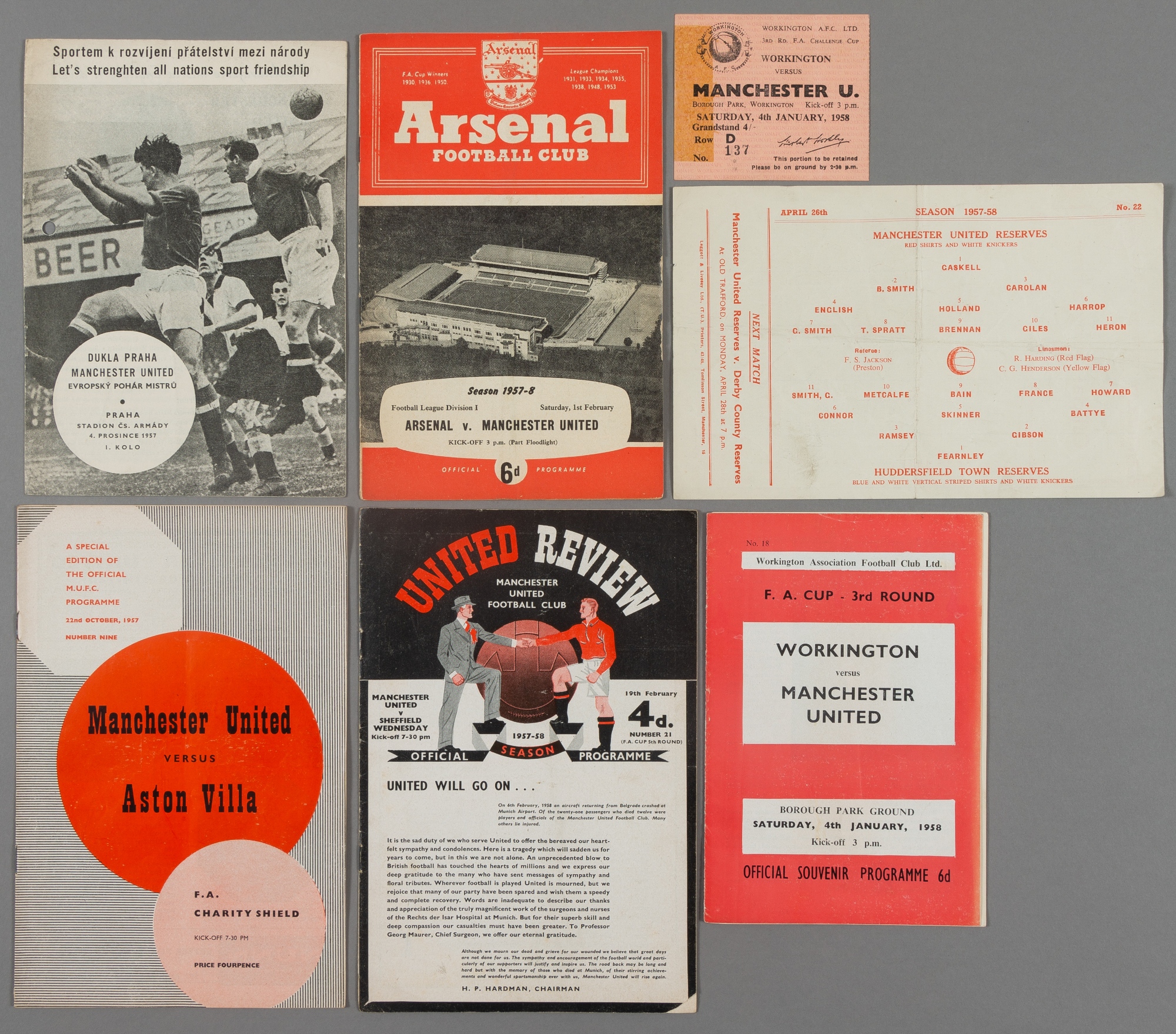 A good collection of 87 Manchester United programmes from the 1957-58 'Munich' season, comprising: including all homes and aways in the League and F.A. Cup plus the Final at Wembley, the Workington away in the Cup complete with ticket; also all European Cup homes and the aways at Shamrock Rovers and Dukla Prague (punch-holed); together with 21 homes reserves, all but two lacking tokens; 3 F.A. Youth Cup homes (only Doncaster with token); the Charity Shield v Aston Villa; Lancashire Senior Cup v Bolton and Manchester Senior Cup s/f v Oldham; two friendlies v The Army & Staevnet (away); sold with two original newspapers with coverage of the Munich Air Disaster