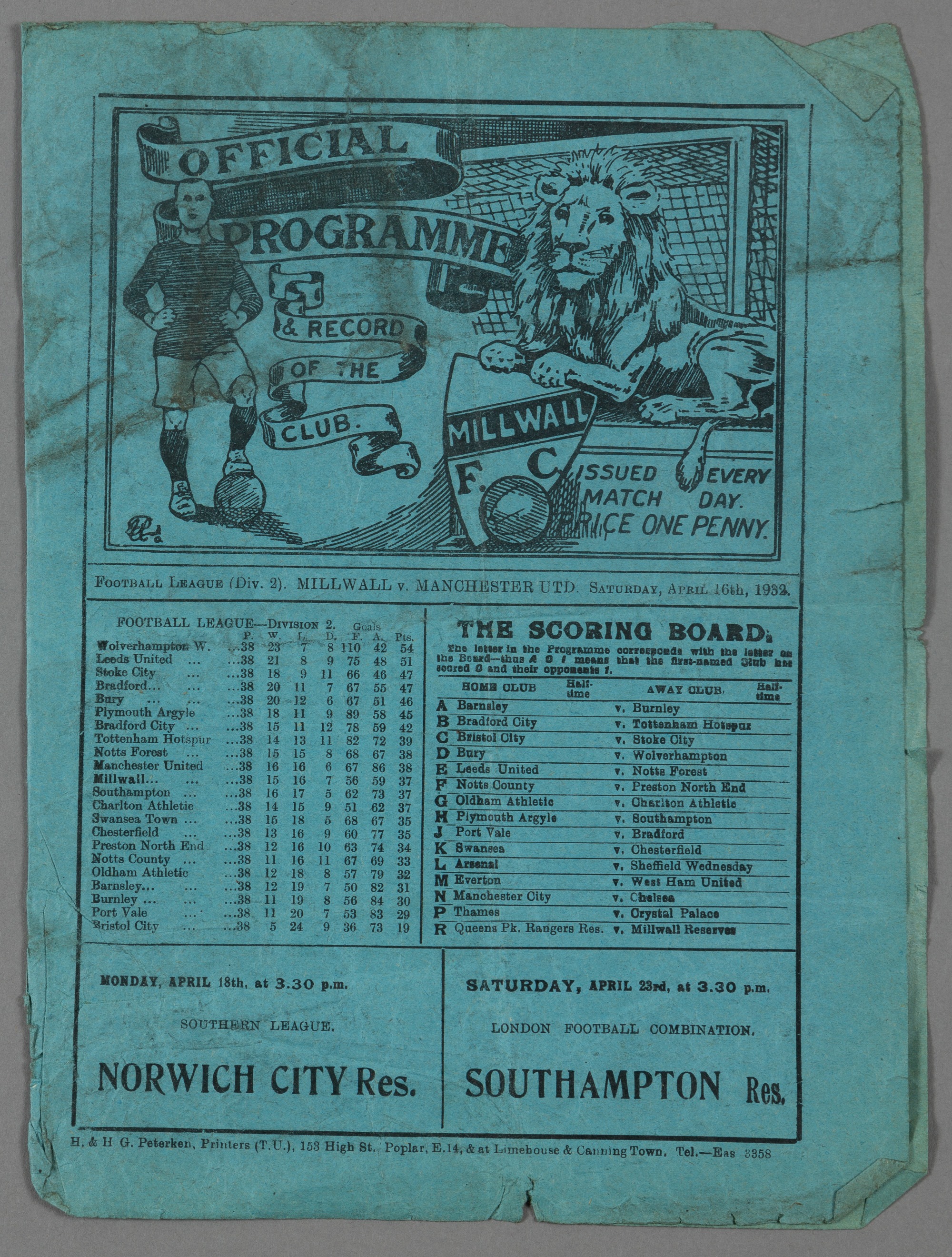 Millwall v Manchester United programme 16th April 1932, F.L. Division Two