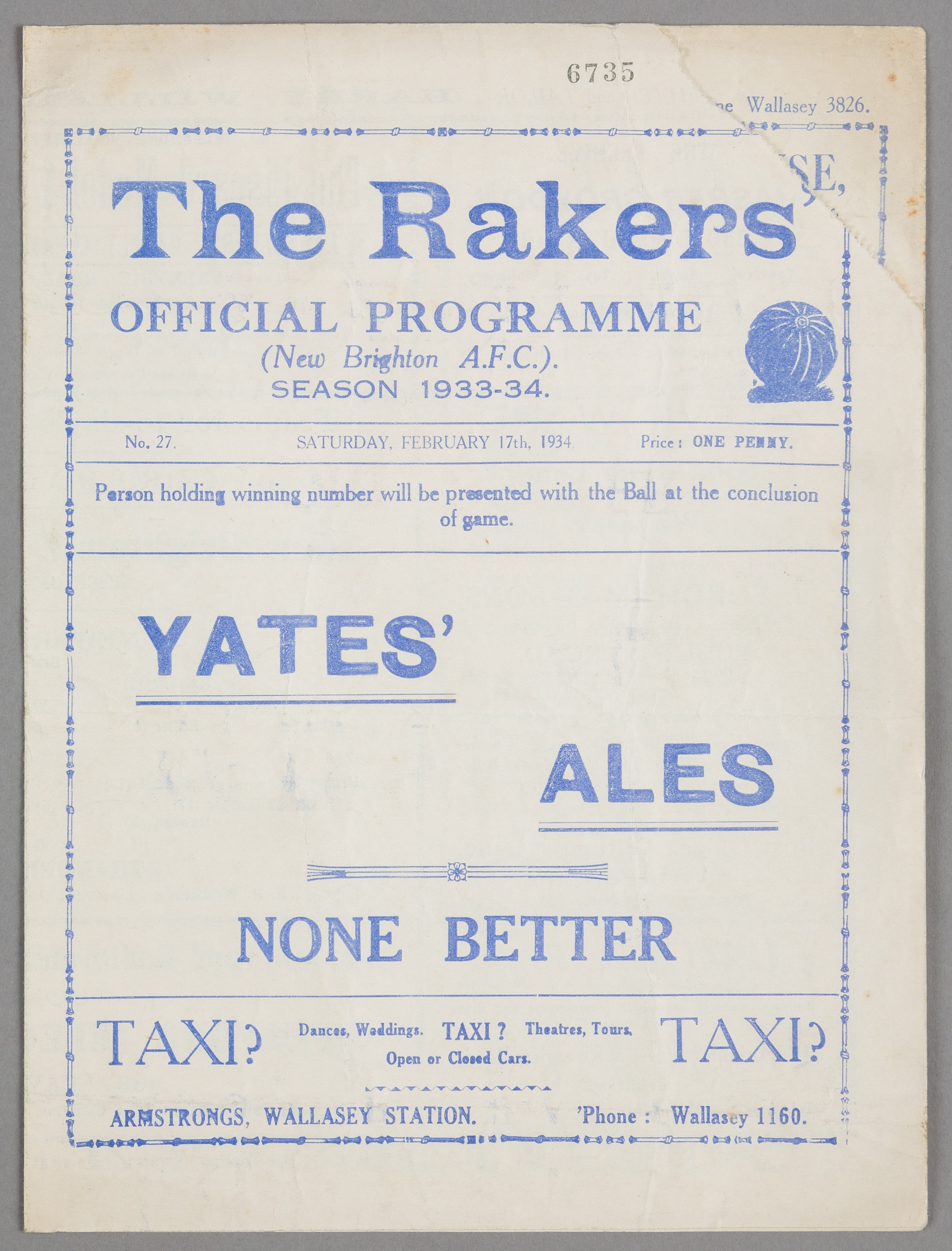 New Brighton v Tranmere Rovers programme 17th February 1934, F.L. Division Three North fixture, paper loss front cover