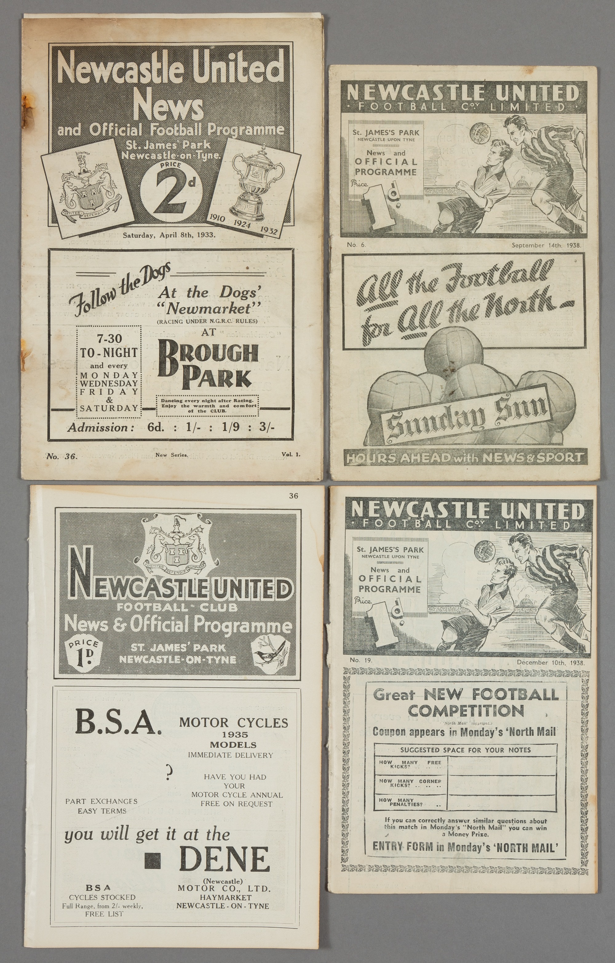 Four Newcastle United 1930s home programmes, F.L. Division One v Sunderland 8th April 1933; and F.L. Division Two matches v Sheffield United 23rd March 1935, WBA 14th September 1938 and Bury 10th December 1938